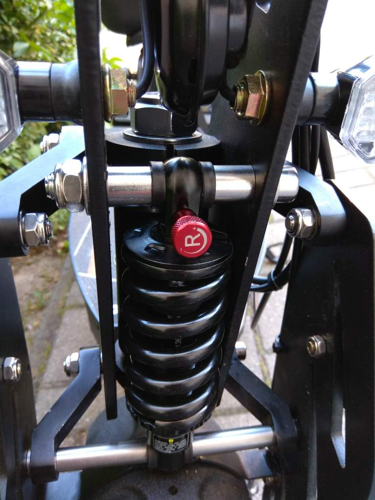 beim umbau vorne gibt es eigentlich nichts besonderes zu beachten. die edelstahllagerhülse des origonalen dämpfers muss man beim neuen dämpfer einsetzen denn dort ist nur eine hülse für M8 drinne aber der scooter hat oben M10. die muss man aber nur dann beim alten rausmachen und beim neuen rein und die schwarzen kunsstoffhülsen wieder drauf. dein mit den originalen abstandshülsen wieder einbauen und feststrauben.
