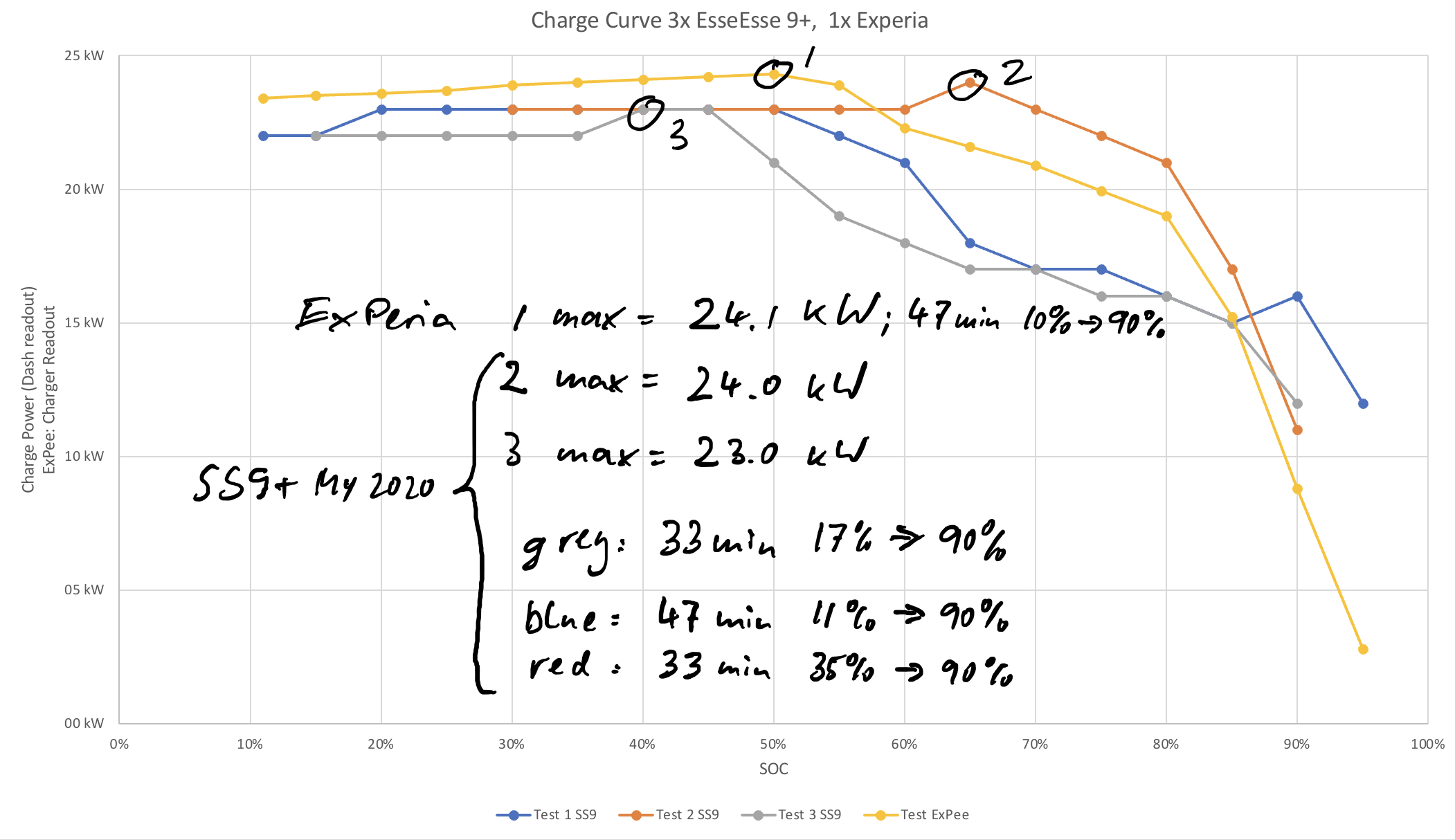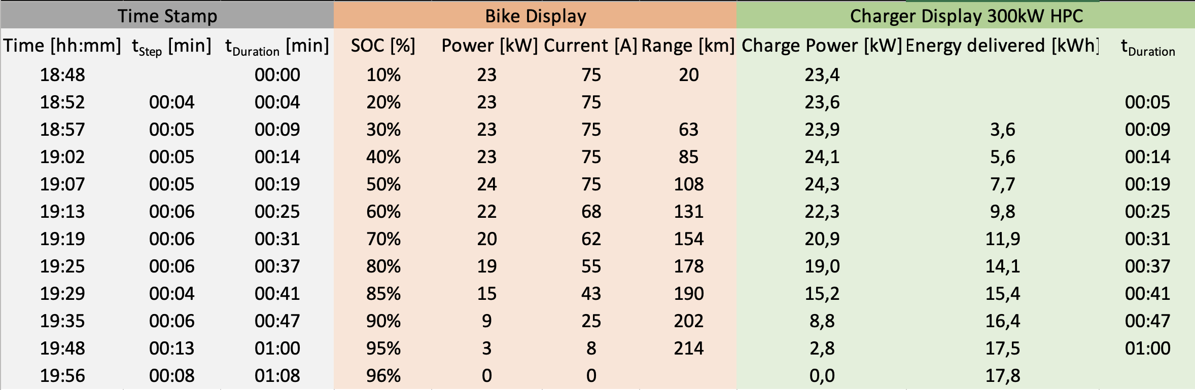 Die Darstellung ist noch nicht schön, aber Inhalte stimmen. Zudem wäre es spannender, die Zeit als x-Achse zu nehmen - nicht SOC. Nun ja, das läuft nicht weg, die Daten habe ich. Besonders jetzt von der ExPee habe ich die Anzeigen der Ladeleistung sowohl vom Bike, als auch vom Lader notiert (letzteres ist im Graph verarbeitet) Schlussfolgerung: Ladeverlauf ExPee ist so ziemlich vergleichbar mit denen der „alten“ Technik, also vor-EMCE-Motor. EMCE sollte auf das Ladeverhalten keinen Einfluss haben, ich wollt‘s nur mal erwähnen.