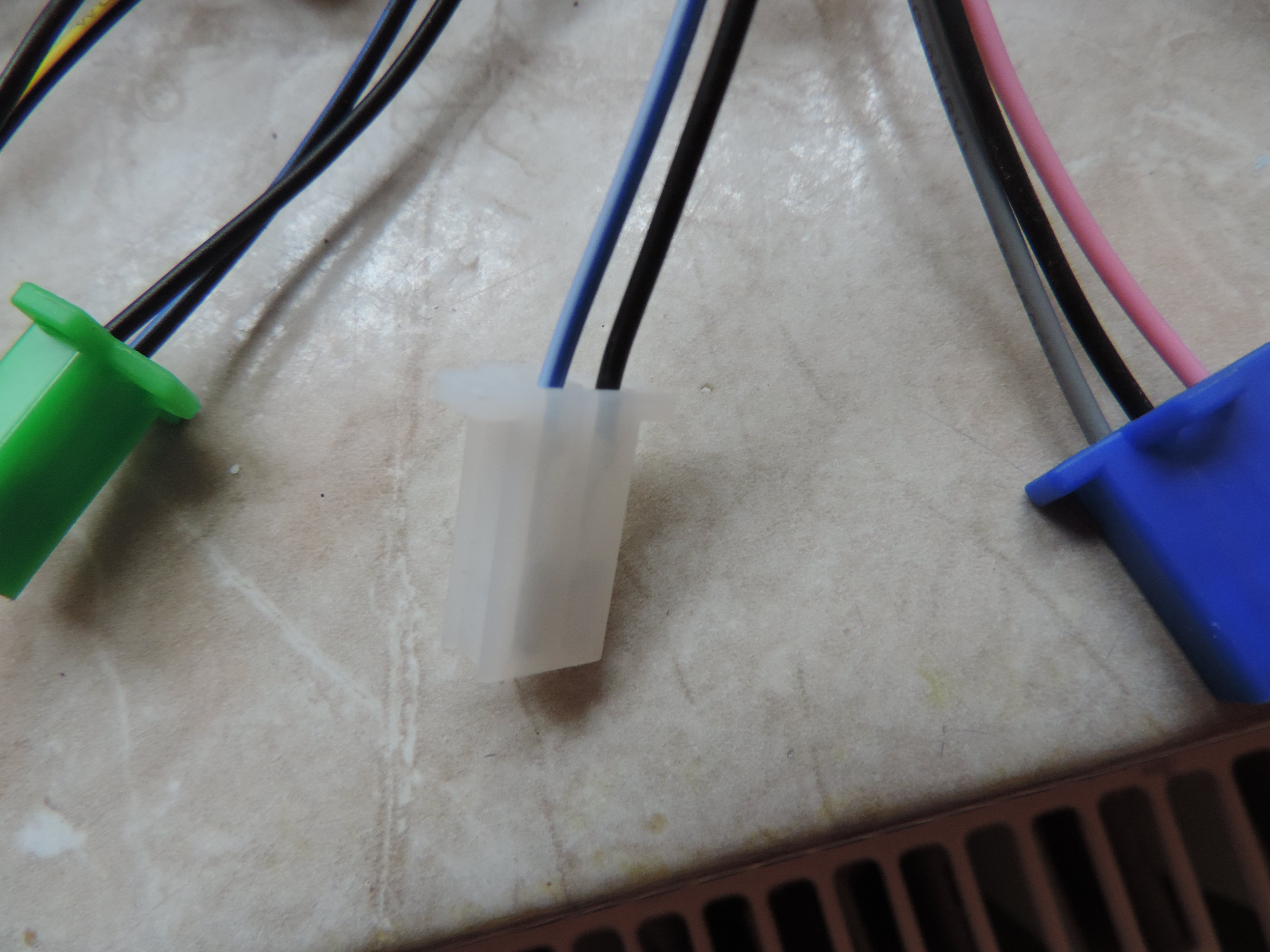 Ofenbar ist der Haken-Stecker (lila-Kabel?) der high Brake-Anschluss am neuen Controller. Da passt zwar der Stecker nicht, aber dort gehört das Kabel drann, bei dem beim Bremsen 12 Volt anliegen (was dann zum Abschalten des Motortriebs führt)