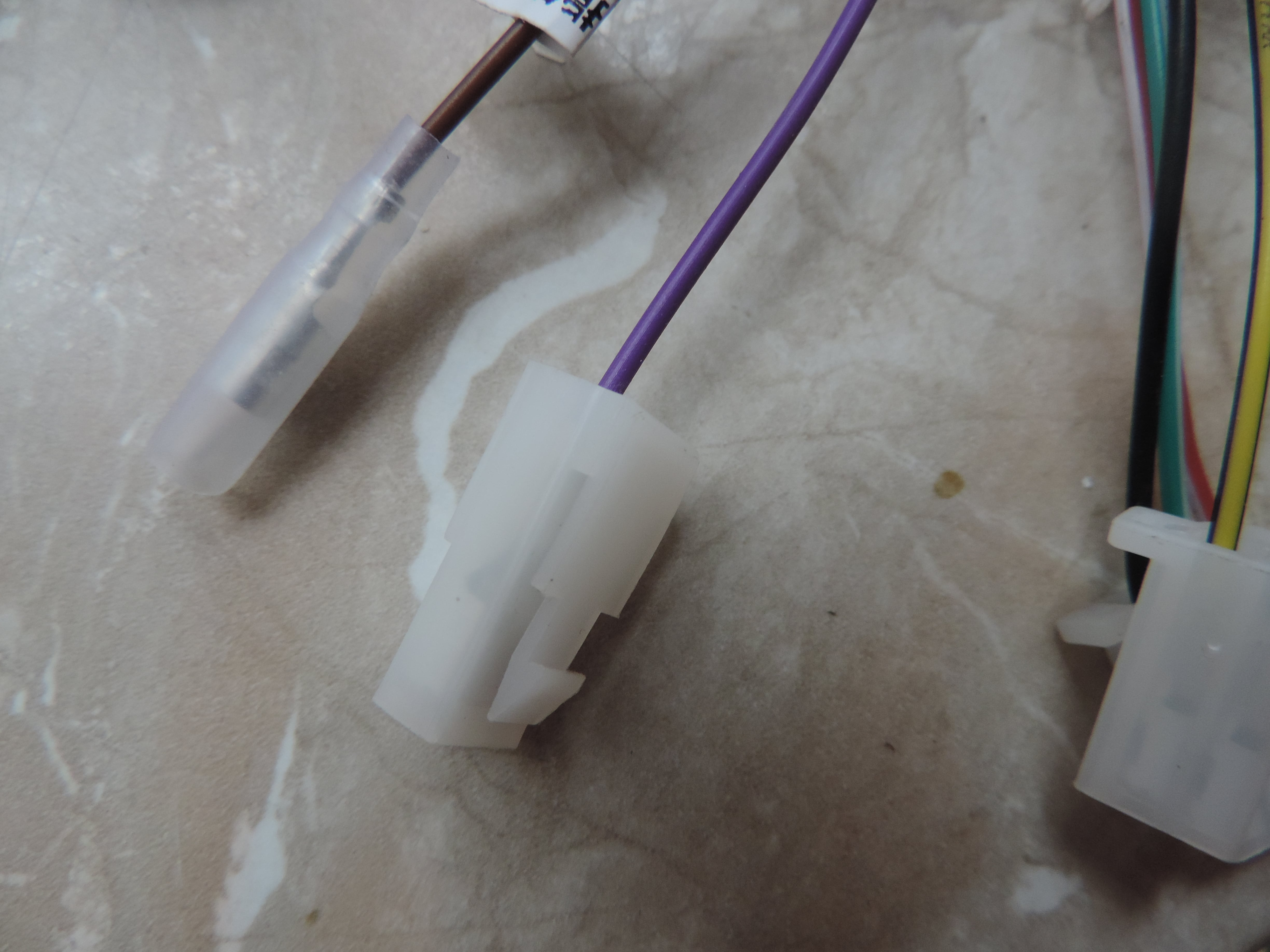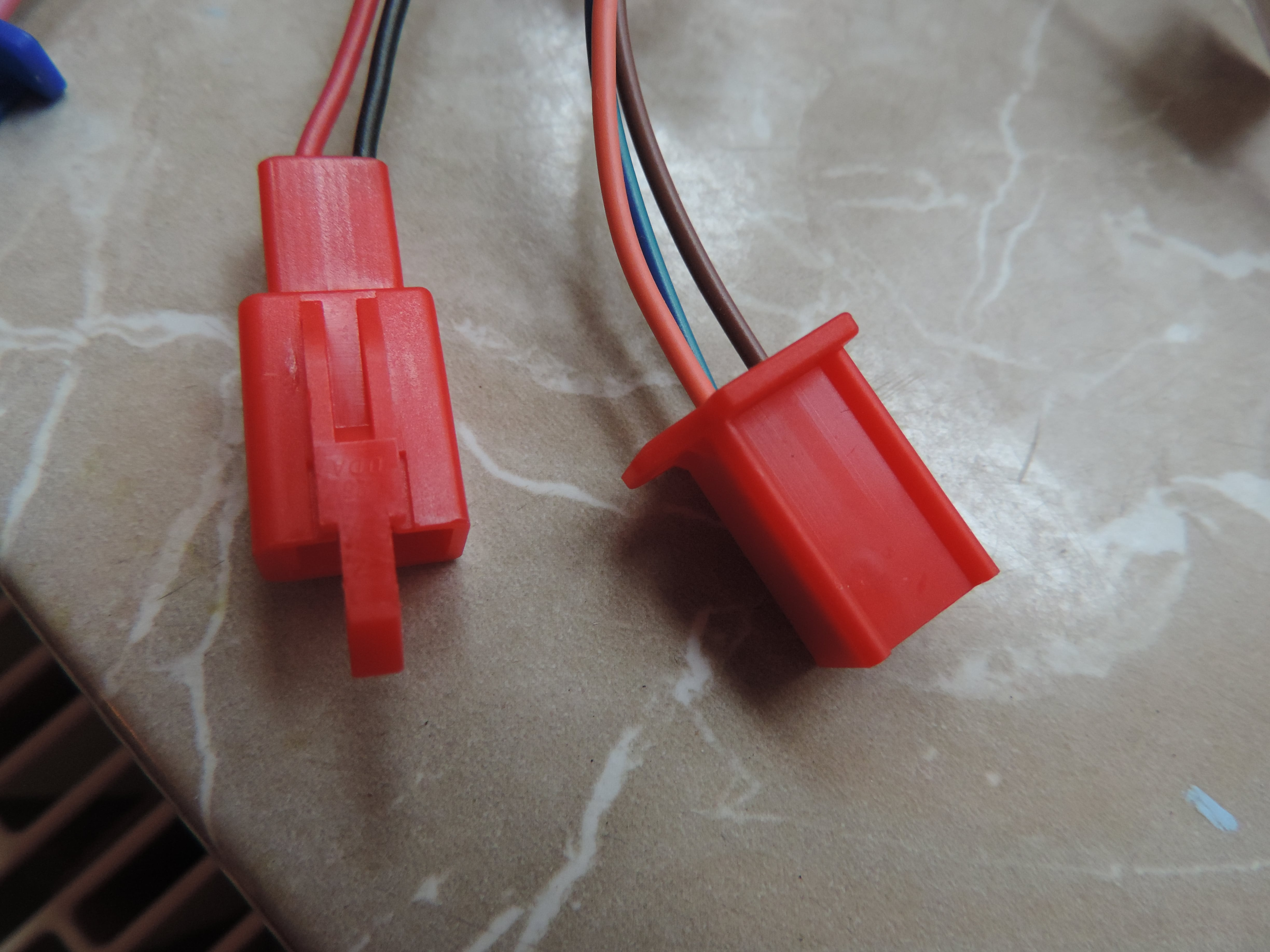 Ofenbar ist der Haken-Stecker (lila-Kabel?) der high Brake-Anschluss am neuen Controller. Da passt zwar der Stecker nicht, aber dort gehört das Kabel drann, bei dem beim Bremsen 12 Volt anliegen (was dann zum Abschalten des Motortriebs führt)
