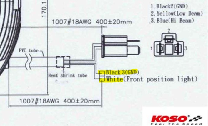 der Scheinwerferstecker passt genau. Der weisse Stecker rechts ist für das Standlicht. Den hab ich abgezwickt und mit Quetschverbinder angeschlossen, Polarizät beachten! Der Scheinwerfer ist mit dem Lampenhalter schnell montiert. Dann solltest du ja fahren können aussser wenns regnet.