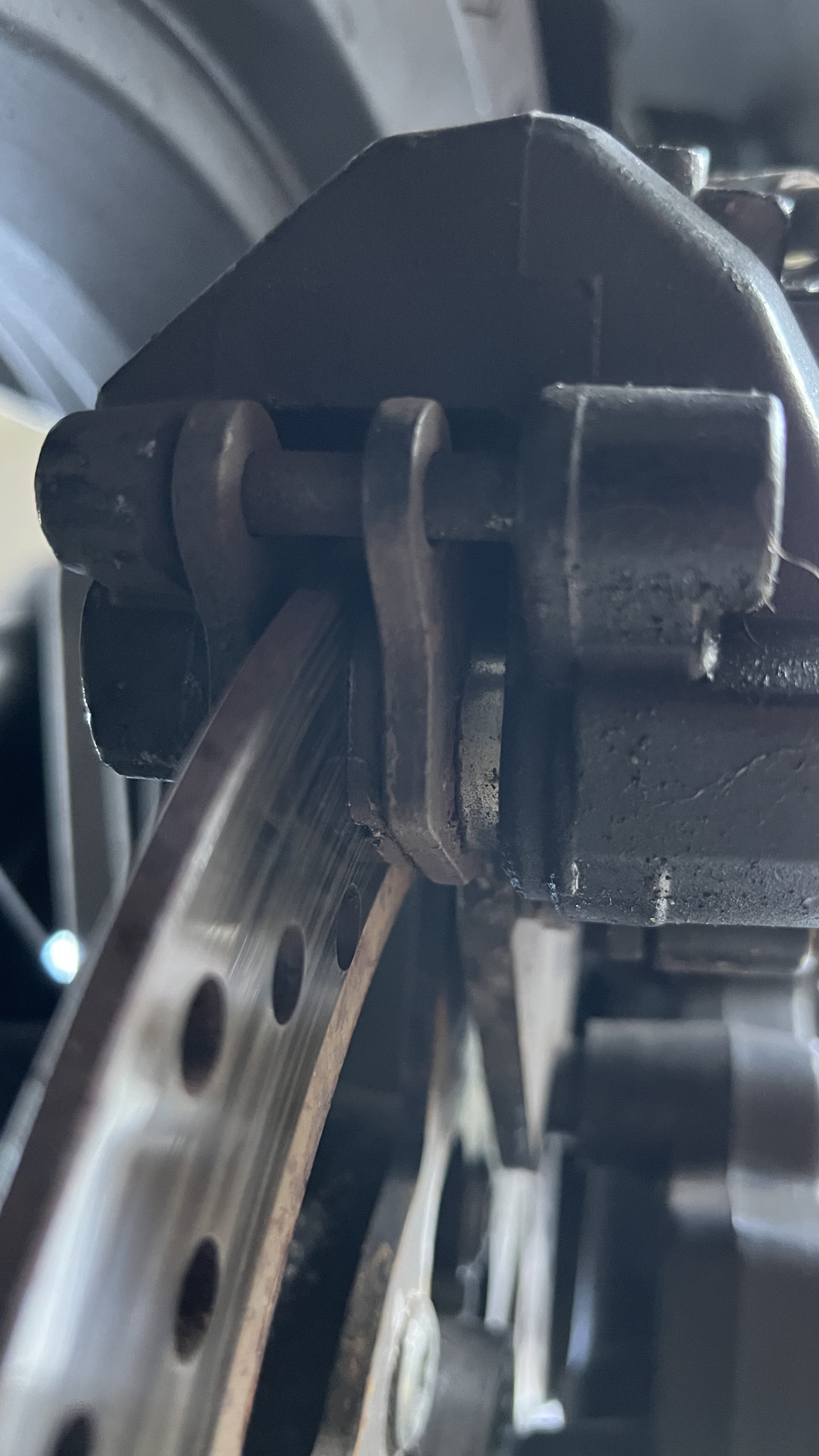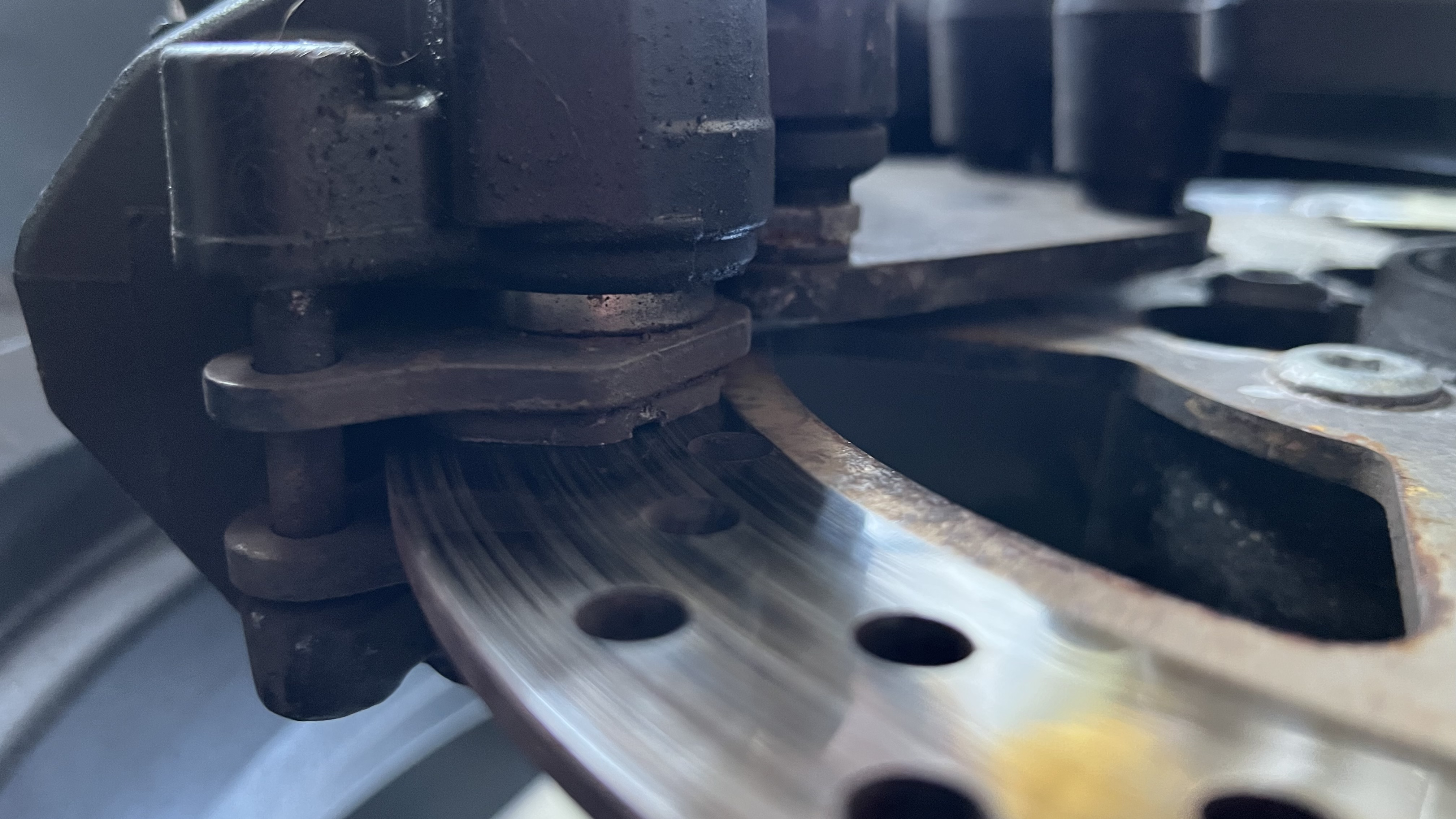 die Führungsbolzen der Beläge sehen sehr rottig aus. Auf diesen Bolzen müssen die Beläge gleiten, damit sie sich nach der Bremsung wieder lösen können und nicht verkanten oder dergleichen.