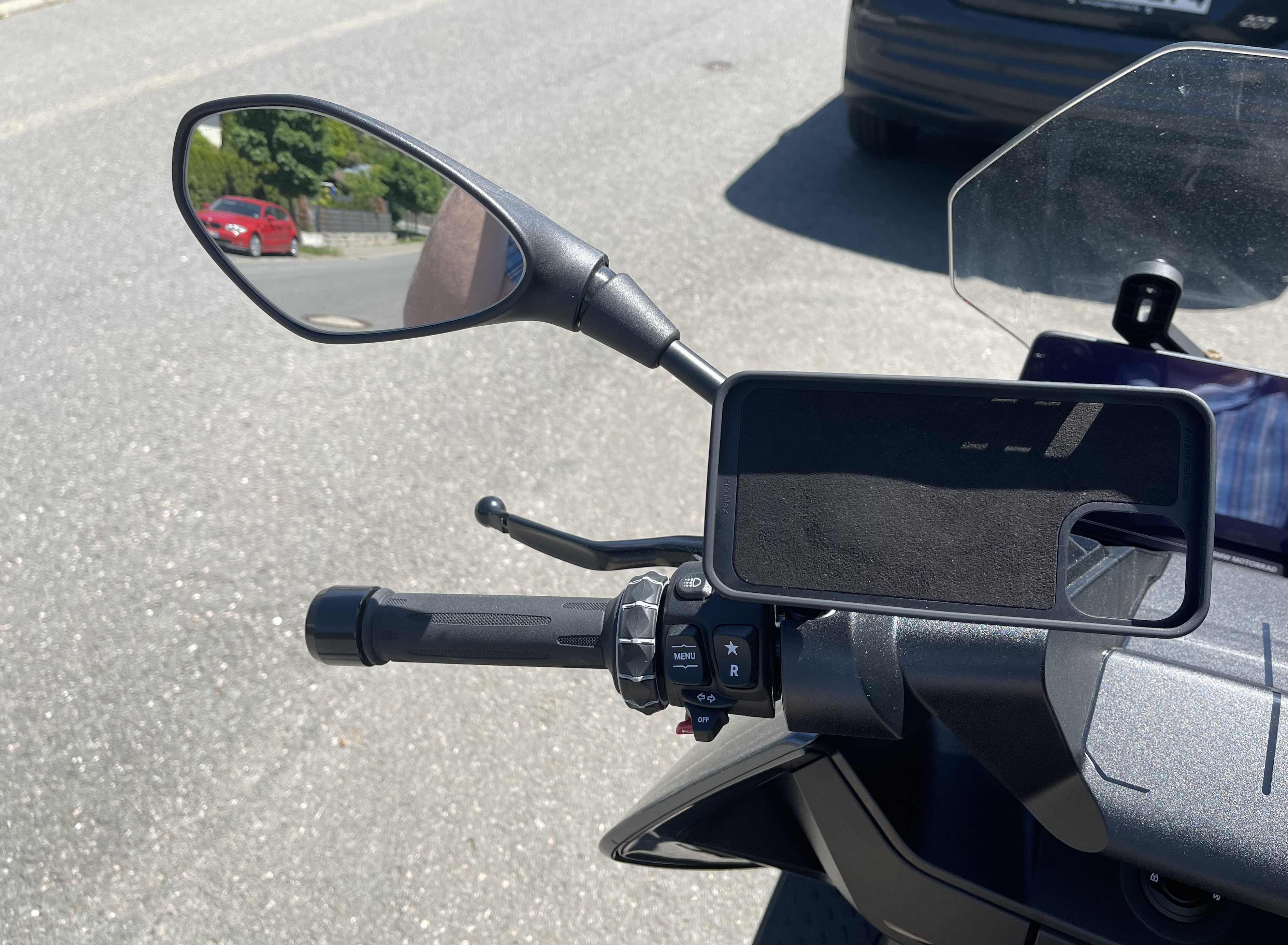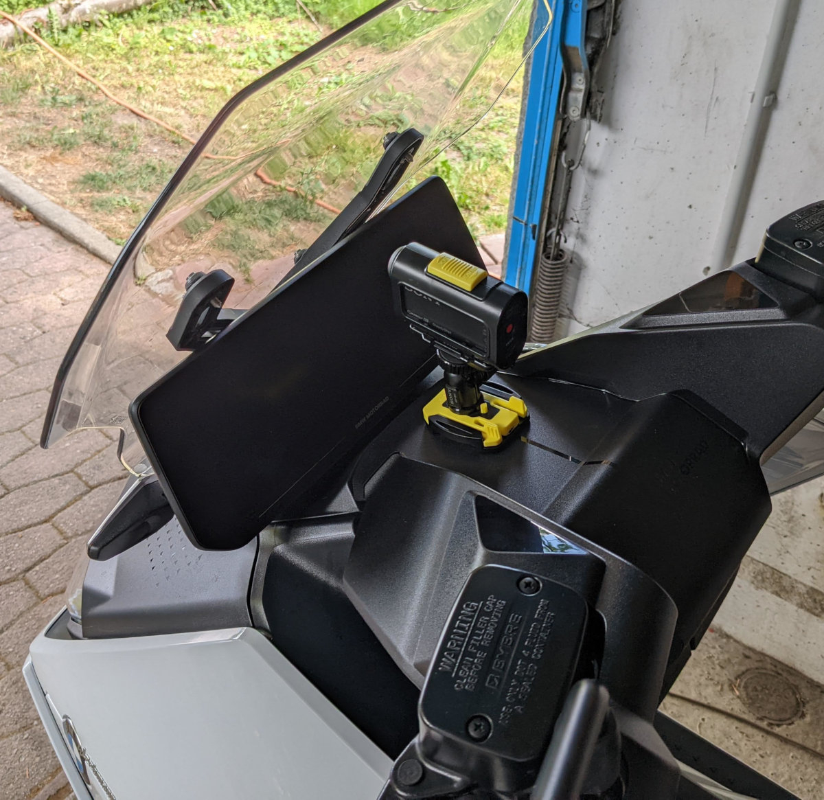 Vielen Dank noch einmal für den Tipp mit SP-Connect. Nachdem mir die Klebeversion zu unsicher und der Bremsflüssigkeitsbehälter zu groß für deren Halterung war, habe ich nun dort eine tolle Lösung für mich gefunden. Den Mirror-Mount Pro, also die Befestigung am Spiegel.