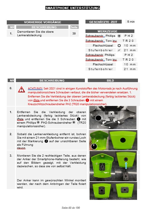 Habe an der Stelle schlicht eine gute Handy-Halterung, allerdings von unten mit der glänzenden Platte verschraubt. Für eine gute Kabelführung muss man die obere Lenkerverkleidung ohnehin abnehmen (jeweils 2 Schrauben links und rechts von unten, der Rest ist geclipst, ziehen an der richtigen Stelle, knifflig) und kommt dann gut zum Kontern ran.