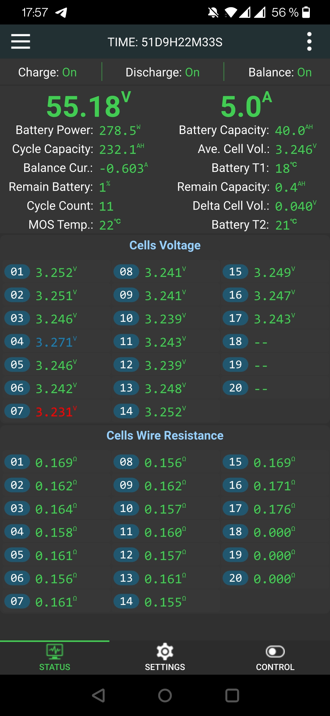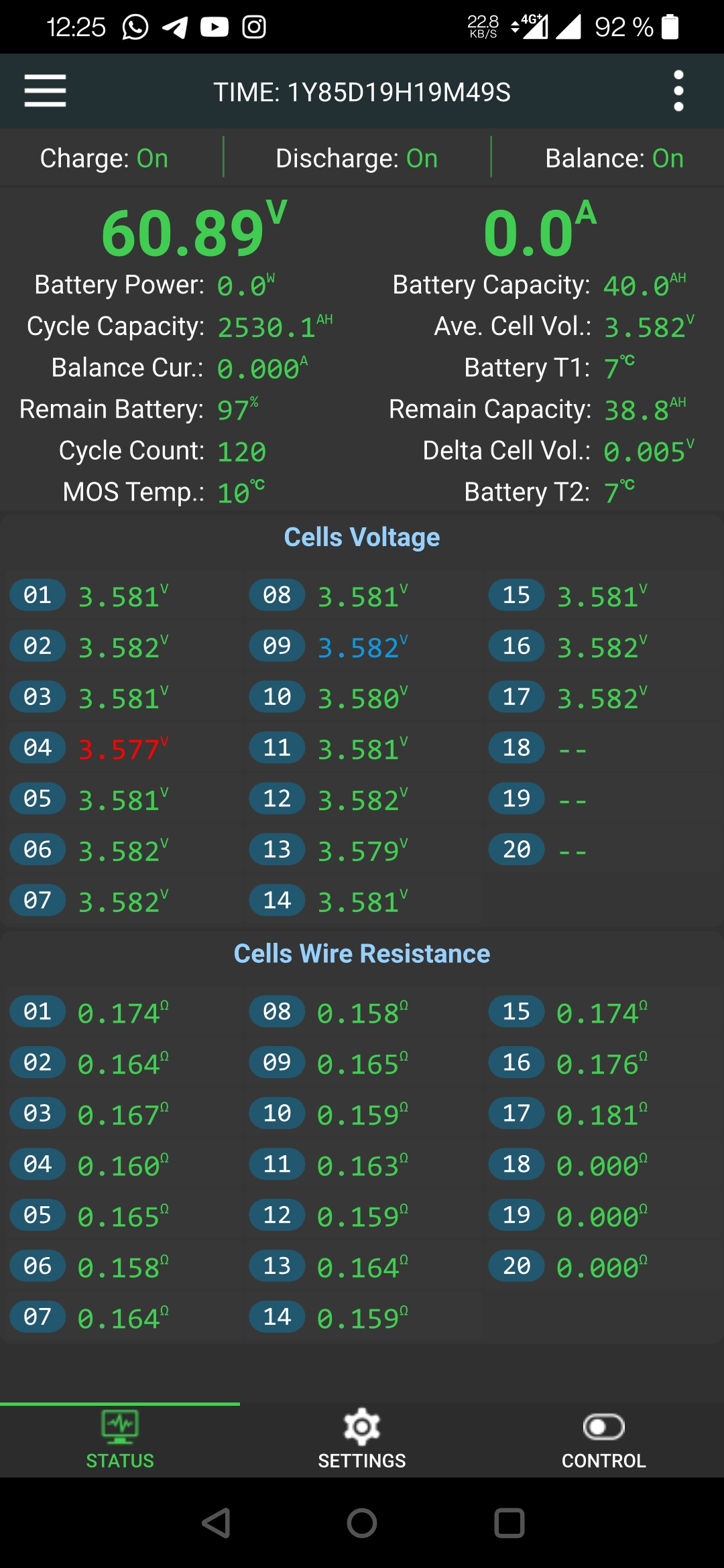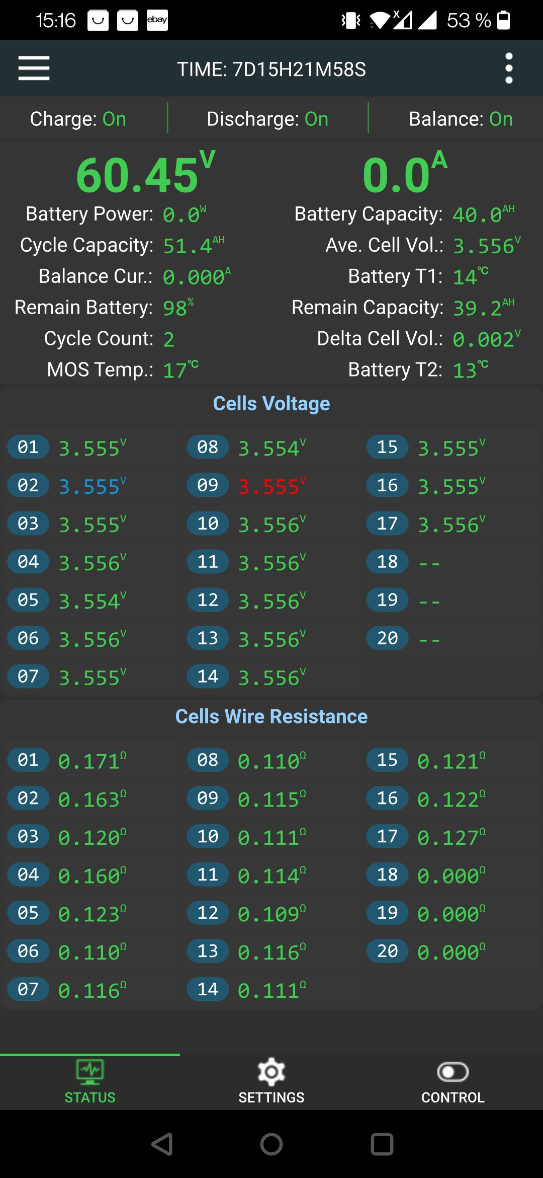 Vermutlich mißt das JK BMS Active Balancer BT mit den Cells Wire Resistance die Innenwiderstände der Zellen. Man kann wohl eine Alterung der Zellen erkennen. Ab 0,75 werden die Zahlen gelb und es geht kaum noch etwas....