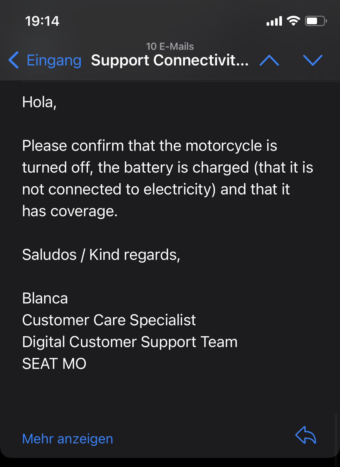 Nachdem die Updates für den Mo meiner Tochter nicht funktioniert haben, hat sie bei Seat (über die App) nochmal angefragt, was dort los ist. Darauf hin folgte dann folgender Mail-Verkehr: