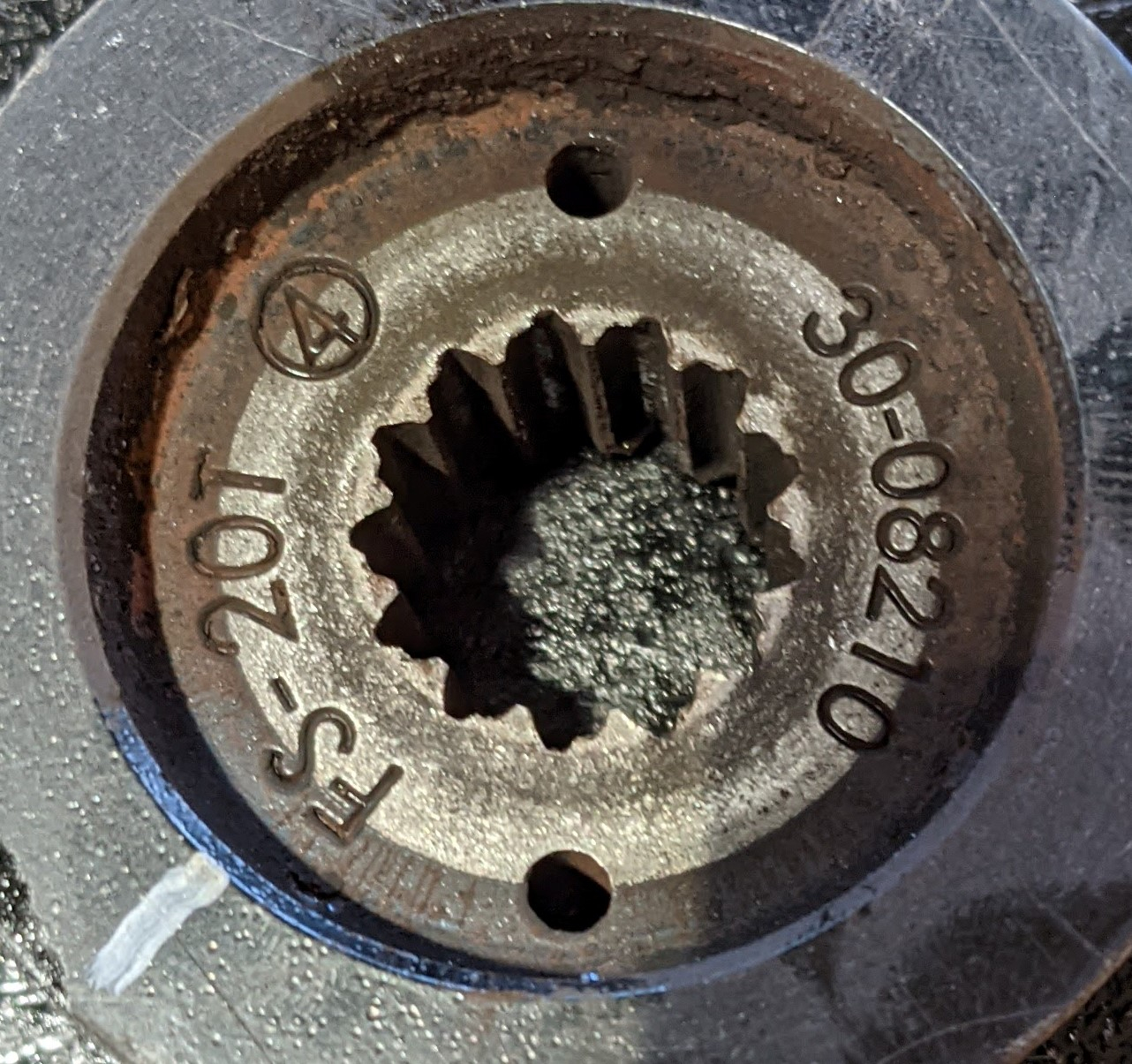 Das Riemenrad sitzt ja direkt auf der Motorwelle und ist deshalb vernünftigerweise etwas weicher als die Motorwelle (Opfermaterial). Problem ist aber das Spiel zwischen Motorwelle und Ritzel. Meiner Meinung nach ist das einfach eine zu ungenaue Fertigung. Da ja 190 NM Drehmoment auf das Ritzel wirken und ich gerne und oft (also eigentlich ständig) vor der Kurve voll rekuperiere und dann im Kurvenscheitelpunkt voll aufziehe hackt die Motorwelle zig mal am Tag voll in das Ritzelspiel. Dann sieht es nach 5000 km schon mal so aus: