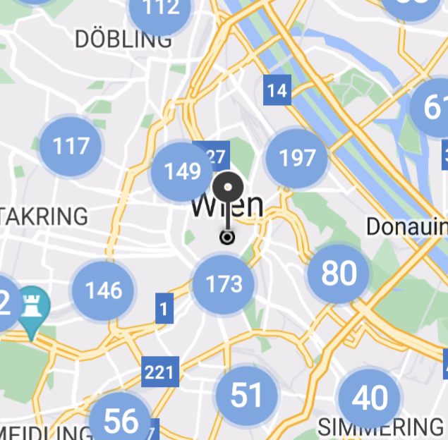 Beispielsweise würde ich in Wien an allen Ladestationen im Screenshot zum genannten Tarif laden. Die blauen Punkte akkumulieren die enthaltene Anzahl Ladestationen in deren Umkreis.