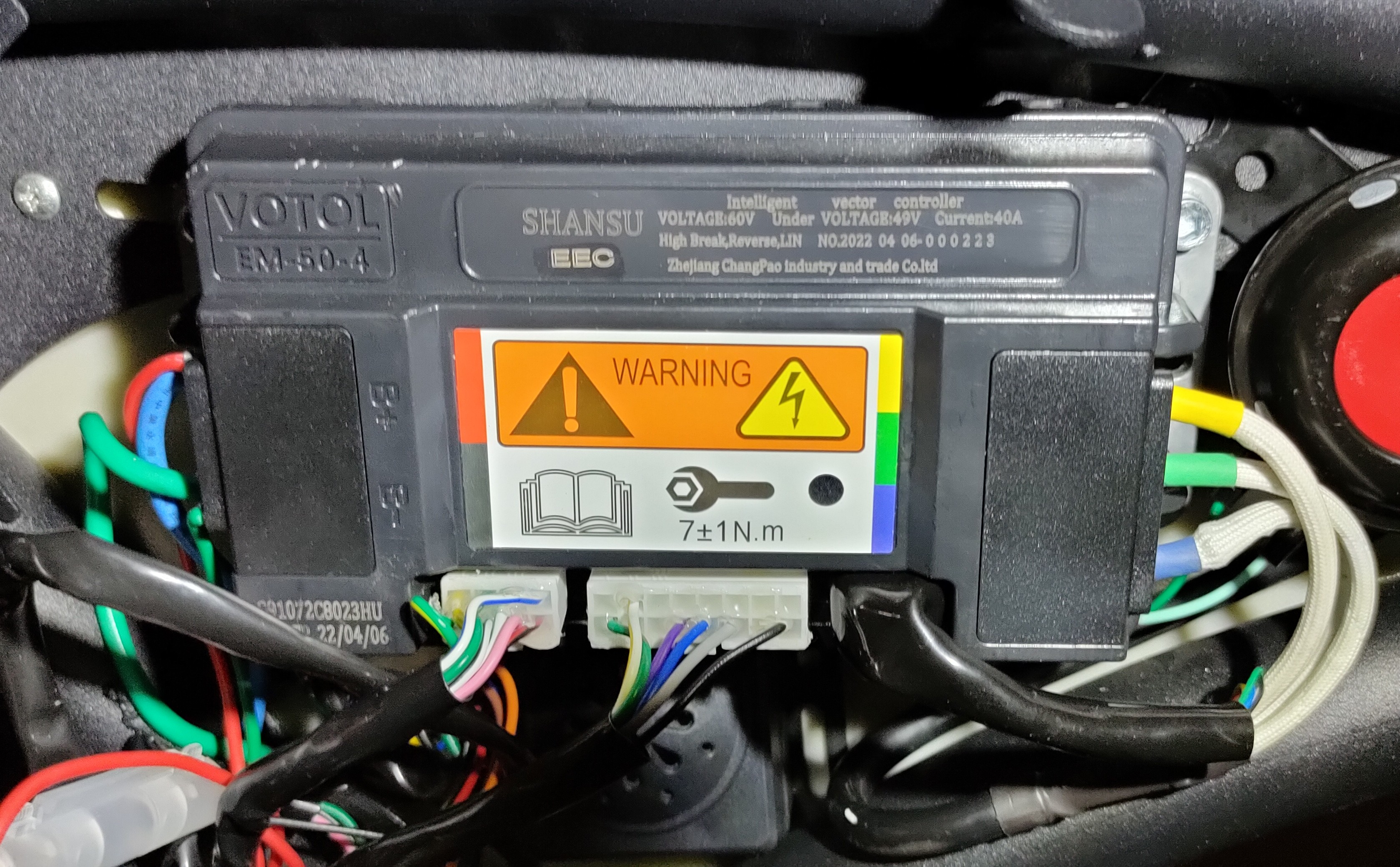 der Controller auf dem Foto scheint (von den Daten her) eine fest eingestellte Variante für 60V zu sein und keine programmierbare Version des VOTOL EM50-4, der so aussieht: Bild