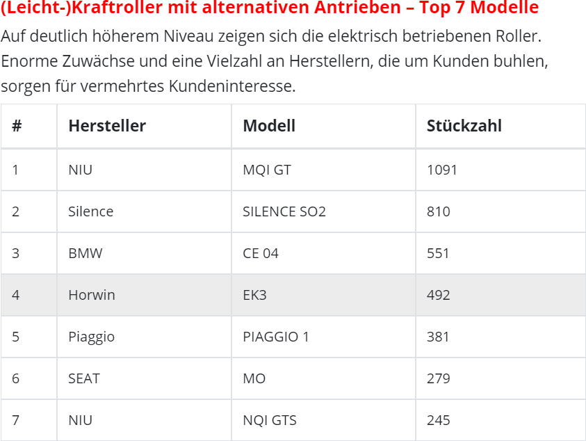 Danke für den Link. Interessante Infos!redstromerbaron hat geschrieben: Do 16. Feb 2023, 10:23 Die Zulassungszahlen sprechen für sich: Elektroroller Zulassungszahlen 2022.png [Quelle: Motorrad & Reisen vom 13.01.2023]