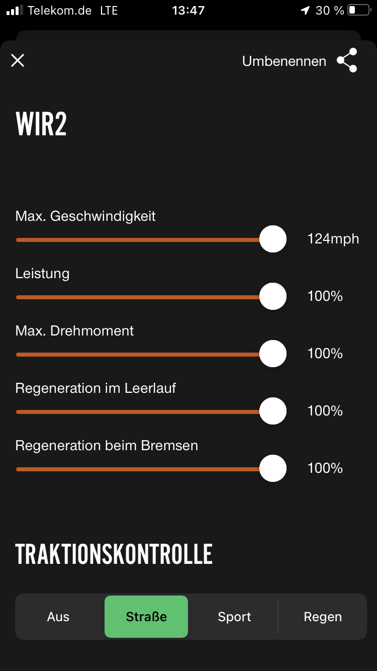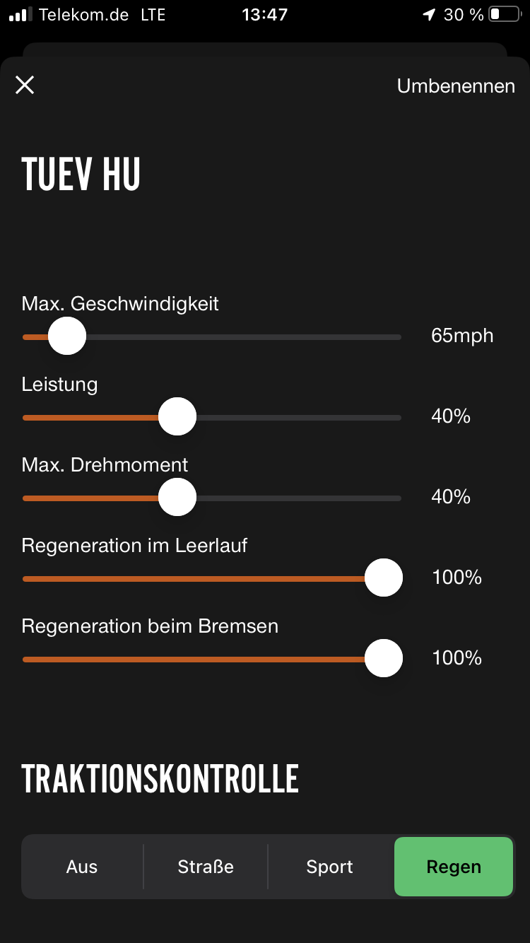 Daher machen für mich die ganzen Modis eigentlich keinen Sinn, da Zero die Dosierung mit der Fahrgriff so perfekt appliziert hat. Daher habe ich alles außer Regeneration im Leerlauf auf max. und 100%. Letzter auf 65% rum, um eine dreifach Abstufung beim langsamer werden zu haben: