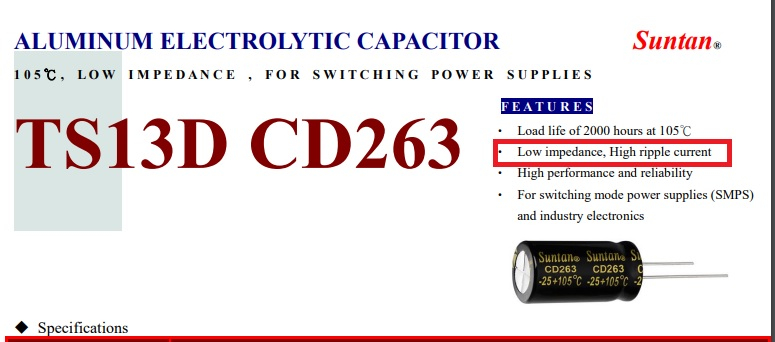 Alles was ich mit CD263 finde sind Kondensatoren ohne die Bewerbung Low ESR. An der Stelle scheint wohl gespart worden zu sein. Auch die 120V sind rech unüblich, normalerweise kommt die Spannungsreihe 63V, 100V, 160V, ....