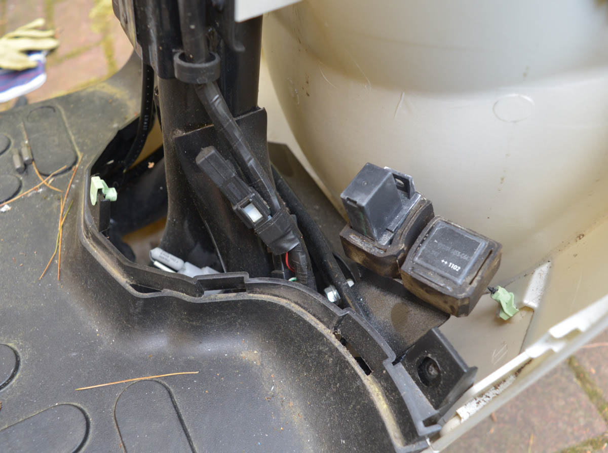 Heute Beinschild, Front Stauraum Demontage 20 Schrauben. DCDC Wandler gefunden (grün). Kurz vorm Anfang des Fußraums, sehr schlecht zugänglich, erfordert Demontage Beinschild . Auf der rechten Seite oberhalb DCDC Blinkrelais, Lastrelais (Licht ?).