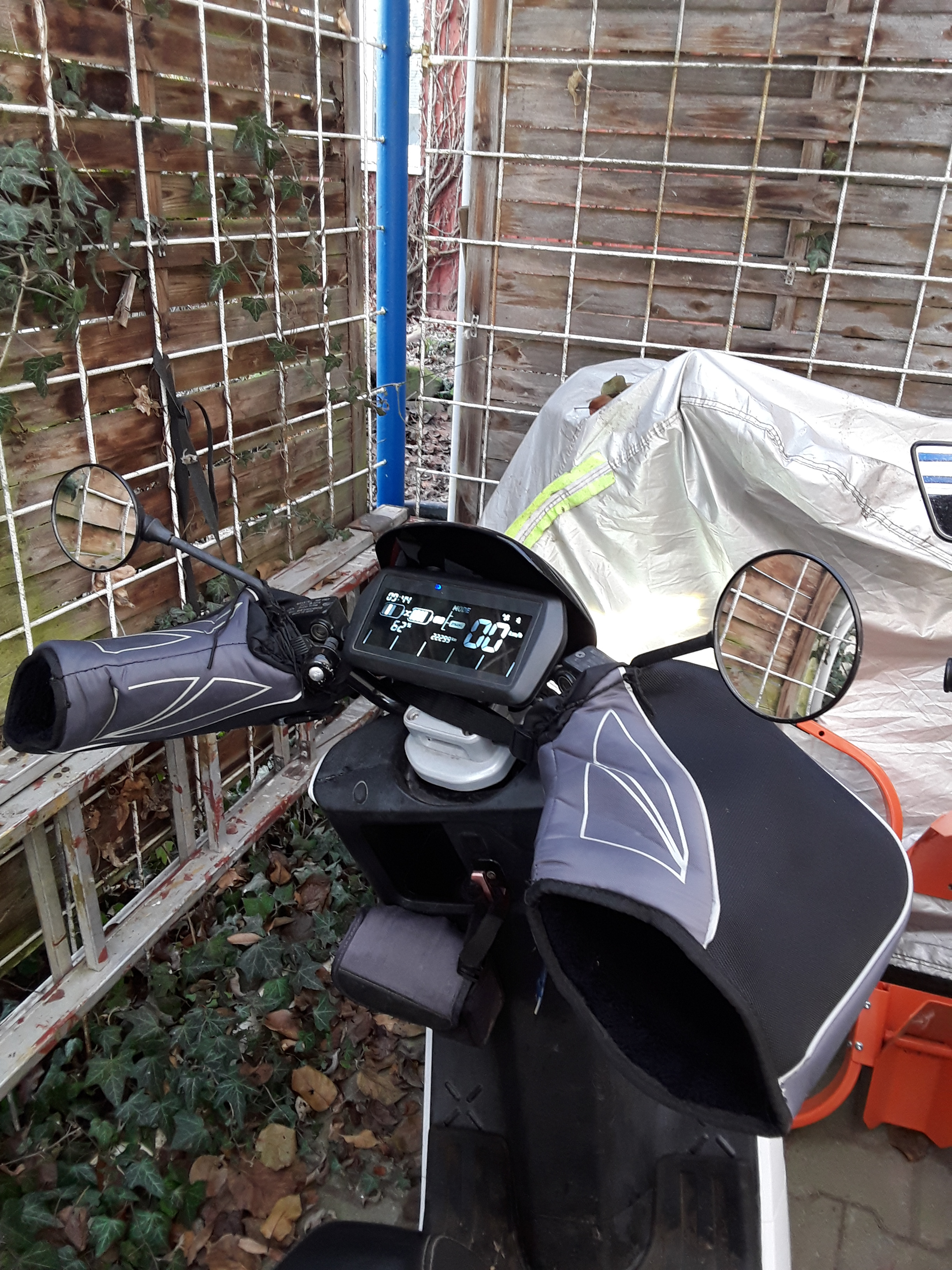 Ich habe noch aus Motorradzeiten alte Gerbing-Heizhandschuhe. Sie heizen außen von den Fingerspitzen bis zum Handgelenk sehr gleichmäßig und sind in drei Stufen gut dosierbar. Mit auf dem Foto ist noch ein anderes Lieblingsteil: eine Windstopper-Sturmhaube, die auch einen Schal überflüssig macht. Entscheidend für die Wirkung der Handschuhe ist der Schutz vor Wind. Man kann übergroße Motorradhandschuhe anziehen. Aber ich habe schon immer Lenkerstulpen benutzt. Neulich habe ich welche von Tucano bekommen - riesige Dinger, die Platz für die Schalter lassen. Man kann sie fast winddicht montieren - mit Heizhandschuhen perfekt. Zuletzt habe ich mir noch eine Winterdecke von Tucano als Knieschutz über Kleinanzeigen erworben. Die italienische Firma Tucano bietet eine fast unüberschaubare Vielfalt ihrer "Termoscud"-Decken an. Sie sind super verarbeitet und wasserdicht, außerdem haben sie Reflexstreifen. In der Seite sind aufblasbare Luftkissen eingearbeitet, die das Flattern wirksam unterbinden.