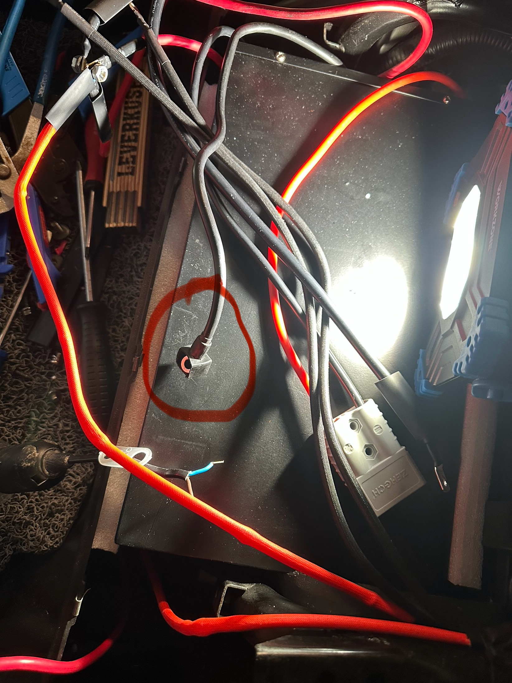 Ich habe angefangen alle roten (+?) Kabel mit der Anderson Kupplung zu verbinden. Beim letzten Kabel gab es einen Knall, funken sprüten und die Öse klebte an der Schraube fest. Es sind aktuell aber noch immer die Akkus demontiert. Eigentlich darf doch gar kein Saft mehr da sein!? Ich verstehe es nicht. Das Kabel von dem der Saft offensichtlich ausgeht führt auch nach vorne und nicht nach hinten.