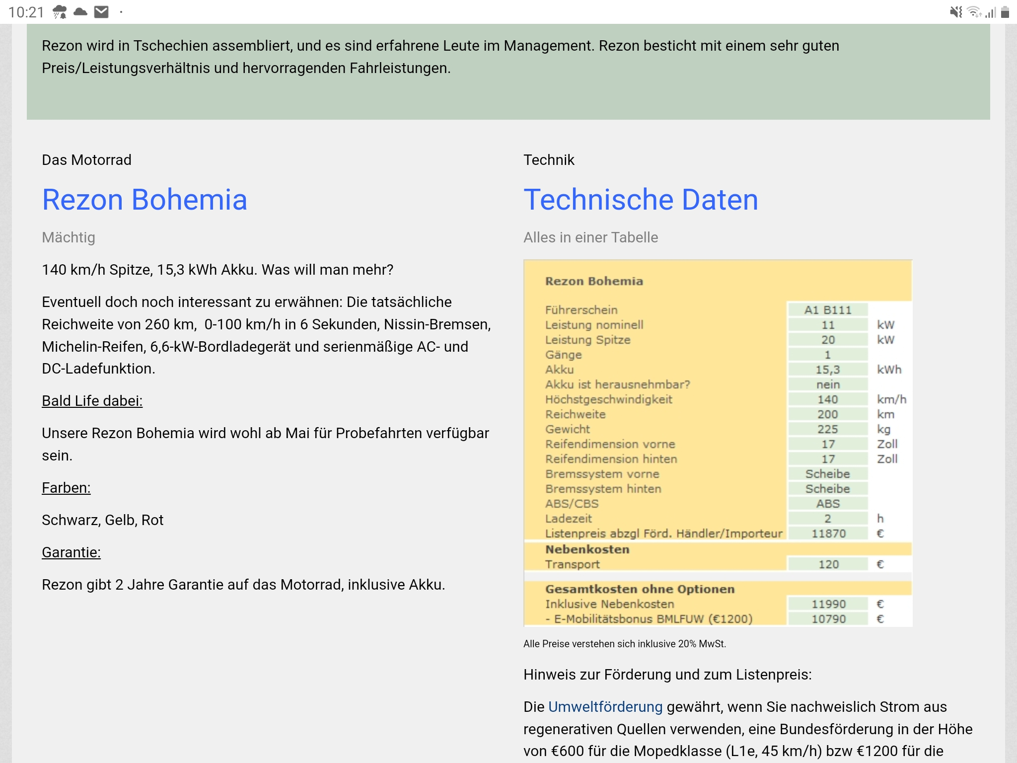 Hab mir mal einen Screenshot erlaubt: vielleicht sollten die Unklarheiten in puncto Reichweite , wenn das Teil gefahren werden kann , auch auf der HP beseitigt werden. Man sieht RW 200km, spricht von echten 260km , die laut Ducatodriver im März auf Tempo 45 km/h eingeschränkt wurden.... realistisch wäre , wenn ich schon soviel ausgeben könnte, käme ich mit ihr zur cousine nach HD in xx std?., also:bikemite hat geschrieben: So 7. Apr 2024, 14:49 ....