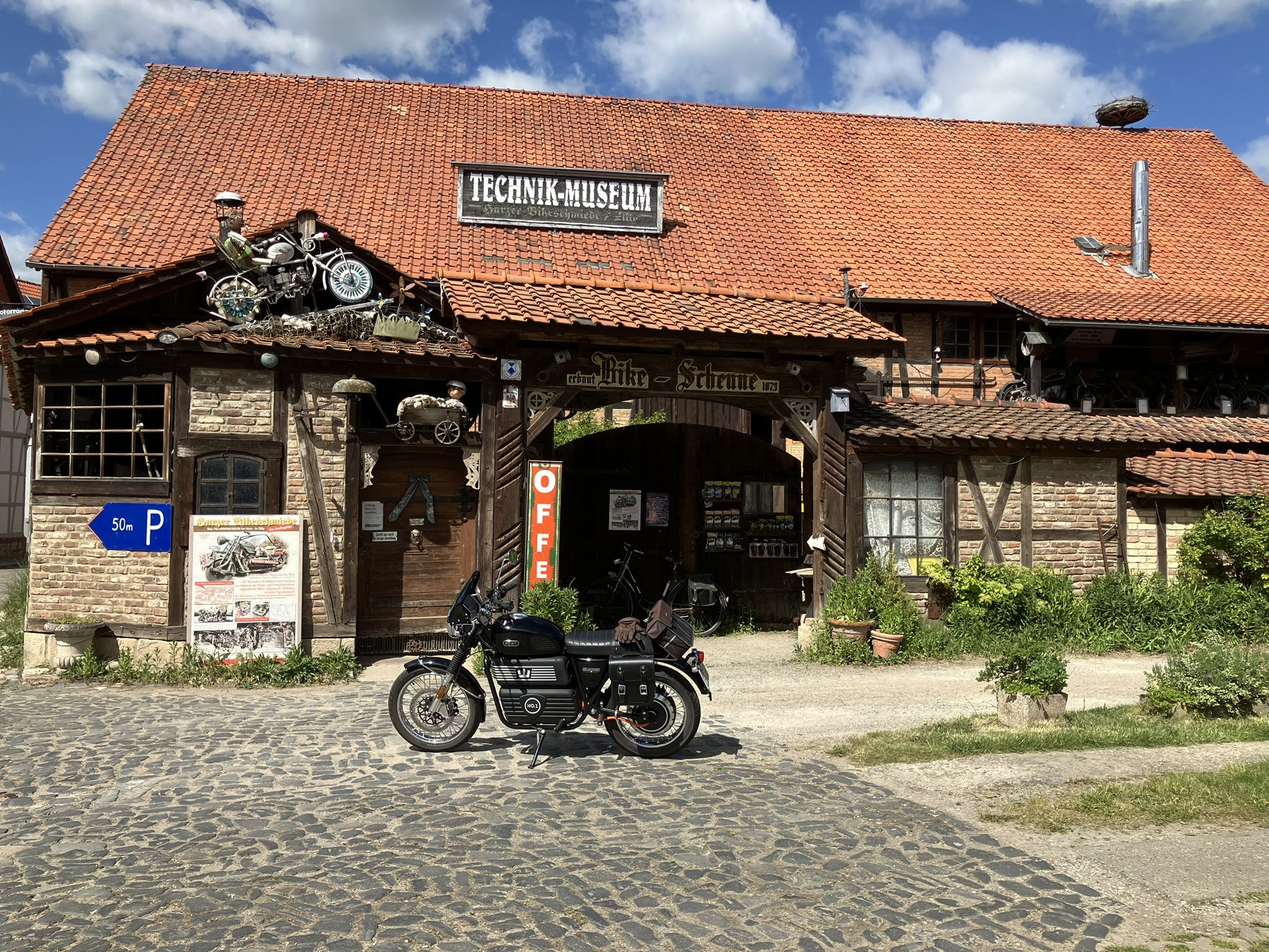 In der Fachwerkstadt Osterwieck wurde ein kurzer Sicherheitsstopp als "Frischzellenkur" für den Akku eingelegt. Danach ging es weiter nach Zilly zur Harzer Bike Schmiede, https://www.harzer-bike-schmiede.de/home.html auf einer alten Hofstelle werden kuriose Eigenbauten, z.B. eie URAL mit zwei Beiwagen, alte Maschinen und Handwerzeuge ausgestellt.