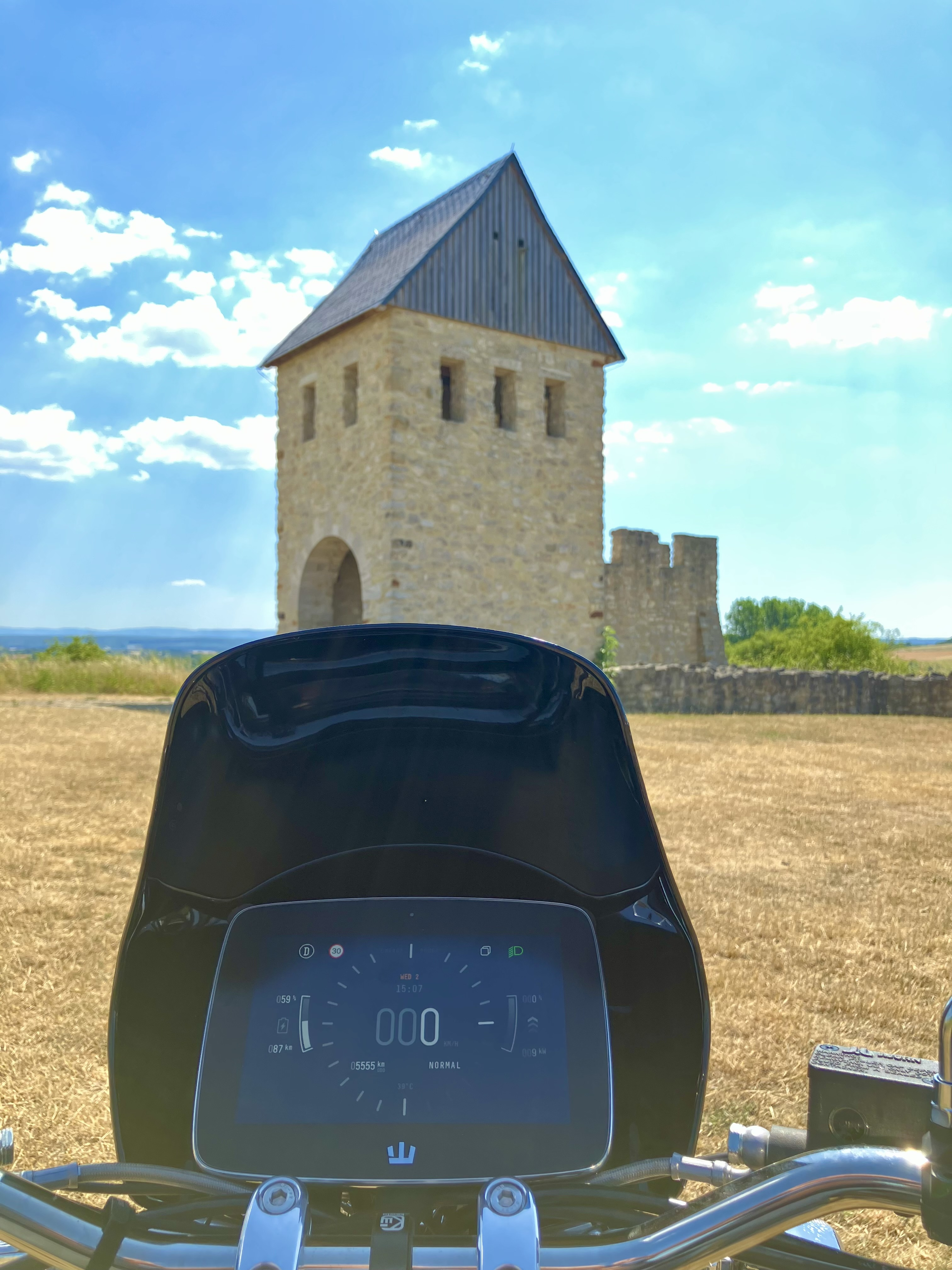 Kaiser und Könige hatten damals keinen festen Wohnsitz, Sie reisten oft zwischen den Pfalzen umher. https://terraxplaincommons.zdf.de/video ... s-clip-102 Meine Reise war gut geplant, um am Zwischenziel die 5555 km auf der Uhr zu haben. Wegen der Mittagshitze von 37 °C im Schatten bin ich heute nur im Range-Modus gefahren, am Ende meiner „Reise“ hatte ich 150 km mehr auf der Uhr und noch 13 % „Rest-Akku“, die Temperatur vom Akku lag zwischenzeitlich bei 46 °C. Die Motortemperatur war immer unter 100 °C.