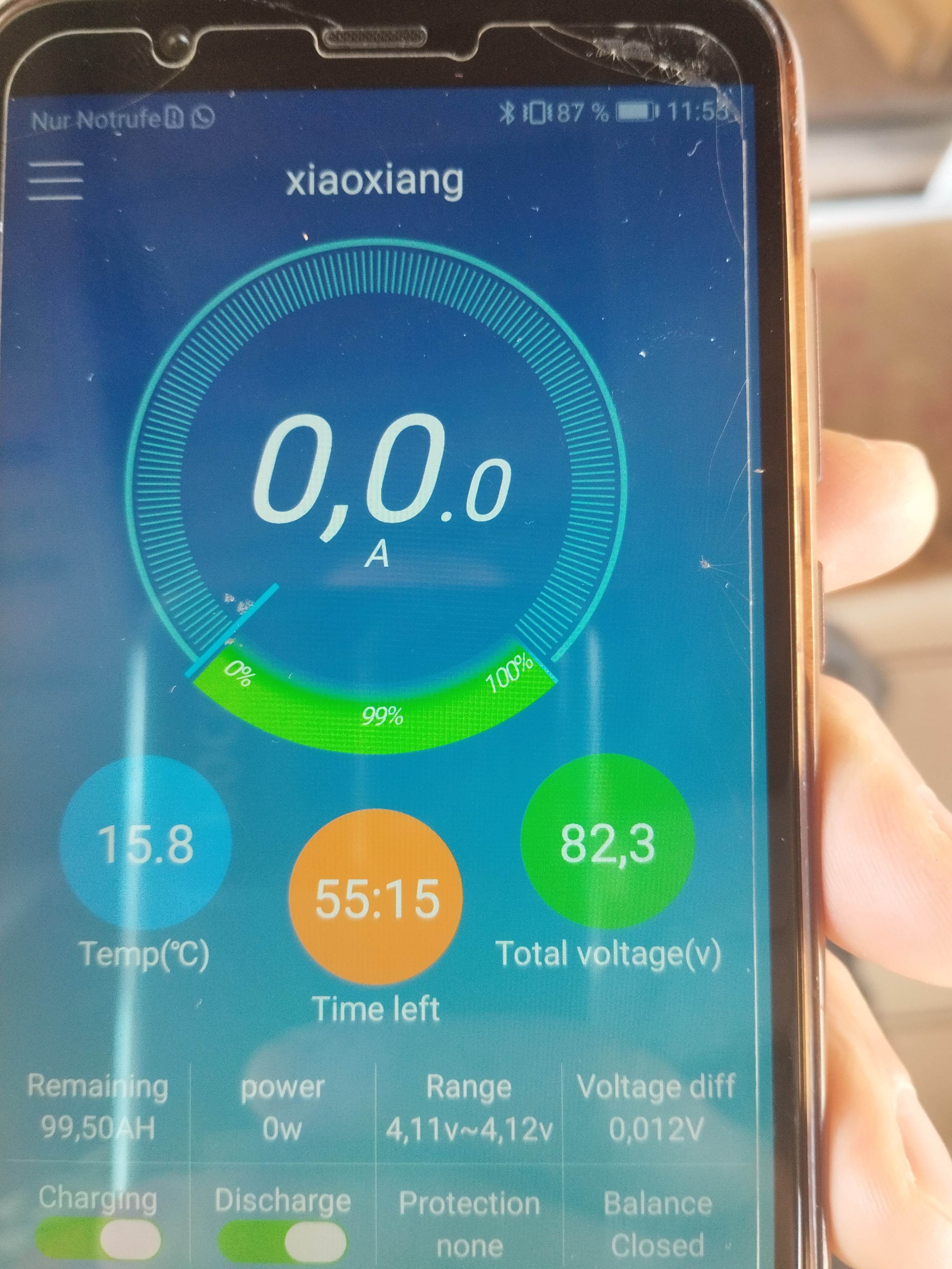 Durch die Entladung unter 3,0 Volt sind die Zellen jetzt etwas aus der Balance geraten. Ich kenne dieses Smart-BMS jetzt nicht, aber vermutlich bietet es auch eine Funktion, zum manuellen Auslösen der Zell-Balancierung. Dazu müssen die Zellen aber vermutlich über 4 Volt liegen, damit es mit dem Balancing funktioniert. Ein sauberer Abgleich gelingt natürlich nur bei 84 Volt Volladespannung und genügend Zeit.