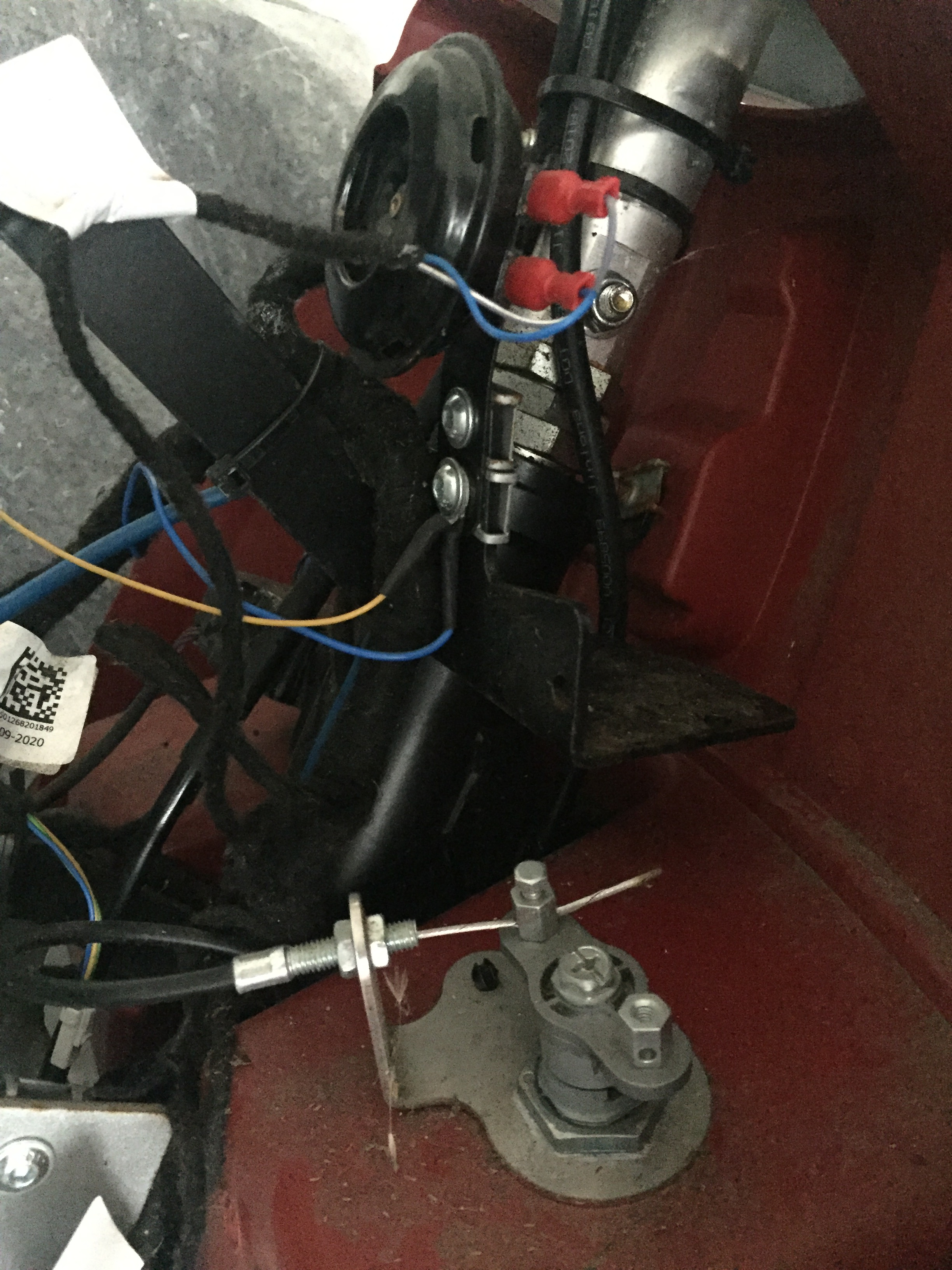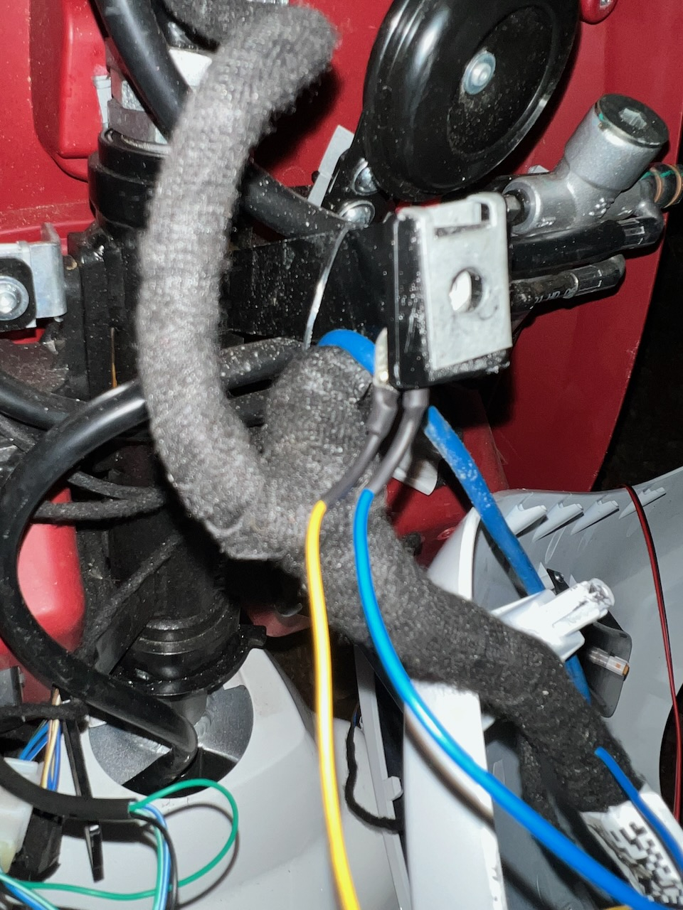 Nochmals danke für Eure Antworten. Ich hab jetzt einfach mal probeweiser beide Ösen der beiden Kabel (ja, gelb und blau) an die Stelle gesteckt, von der ich glaube, dass sie dort hin gehören. Nämlich hinter die Mutter, in die das Frontteil geschraubt wird. Die ist als Clip ausgeführt, so dass man beide Ösen zwischen Mutter und Rahmen stecken und dann festschrauben kann. Siehe Photos.