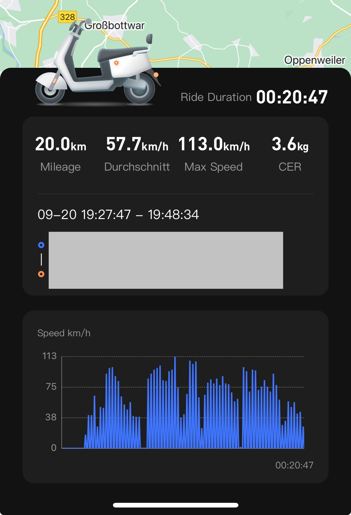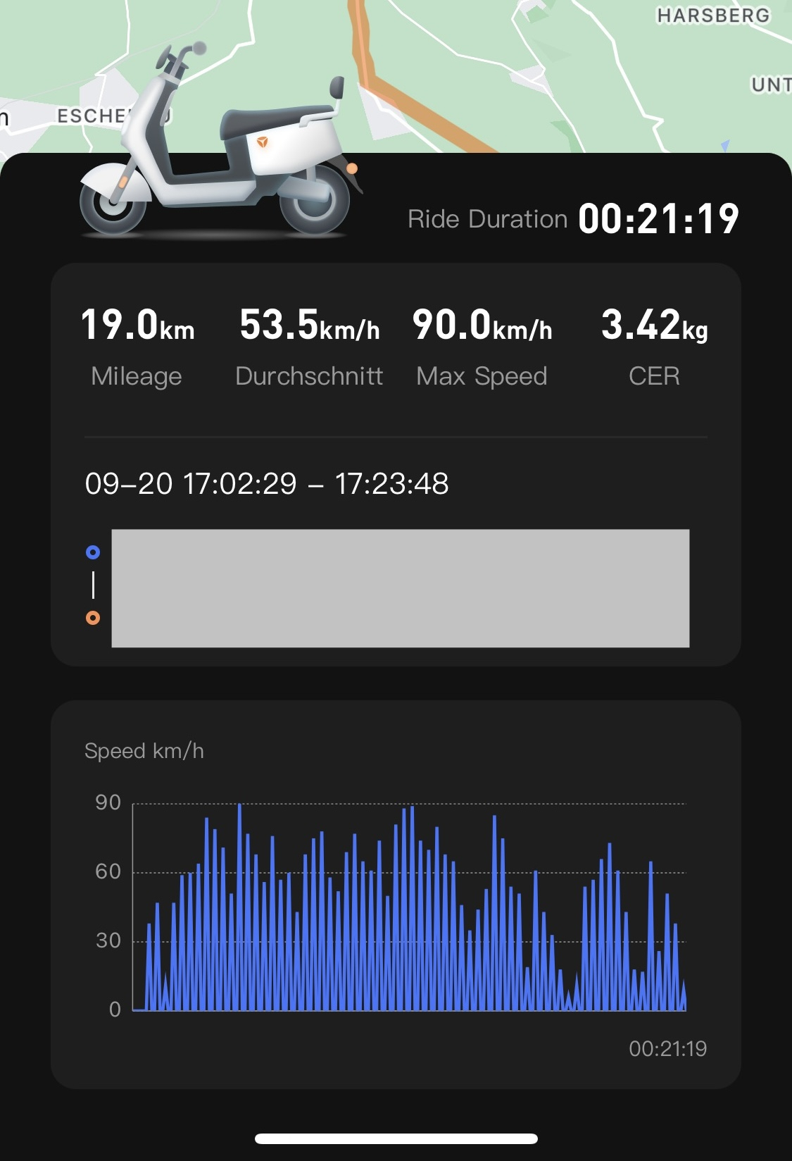 Hallöchen zusammen. Wie versprochen nun mal eine Messung von mir. Ich bin mit vollem Akku gestartet. Habe auf zwei Etappen 39km gemacht. Komplett Überland. Am Ende der beiden Fahrten wurde mir ein Batterieladezustand von 50% angezeigt. Geschwindigkeitsprofile und Durchschnittsgeschwindigkeiten sind in den Bildern unten zu sehen. Es sind 2.34kWh über meine Messsteckdose gegangen. Dies macht einen Verbrauch (inklusive Ladeverlusten) von 6kWh auf 100km. Das ergibt rechnerisch eine Reichweite von 64.8km. Wenn man einen Ladegerät-Wirkungsgrad von 83% annimmt, was dem verbleibenden Ladezustand am Ende der beiden Fahrten entspricht, käme man rechnerisch auf 78km. Wie in meinen bisherigen Beiträgen beschrieben ist sicherlich mehr drinnen wenn man ein bisschen vernünftig umgeht mit der Energie!