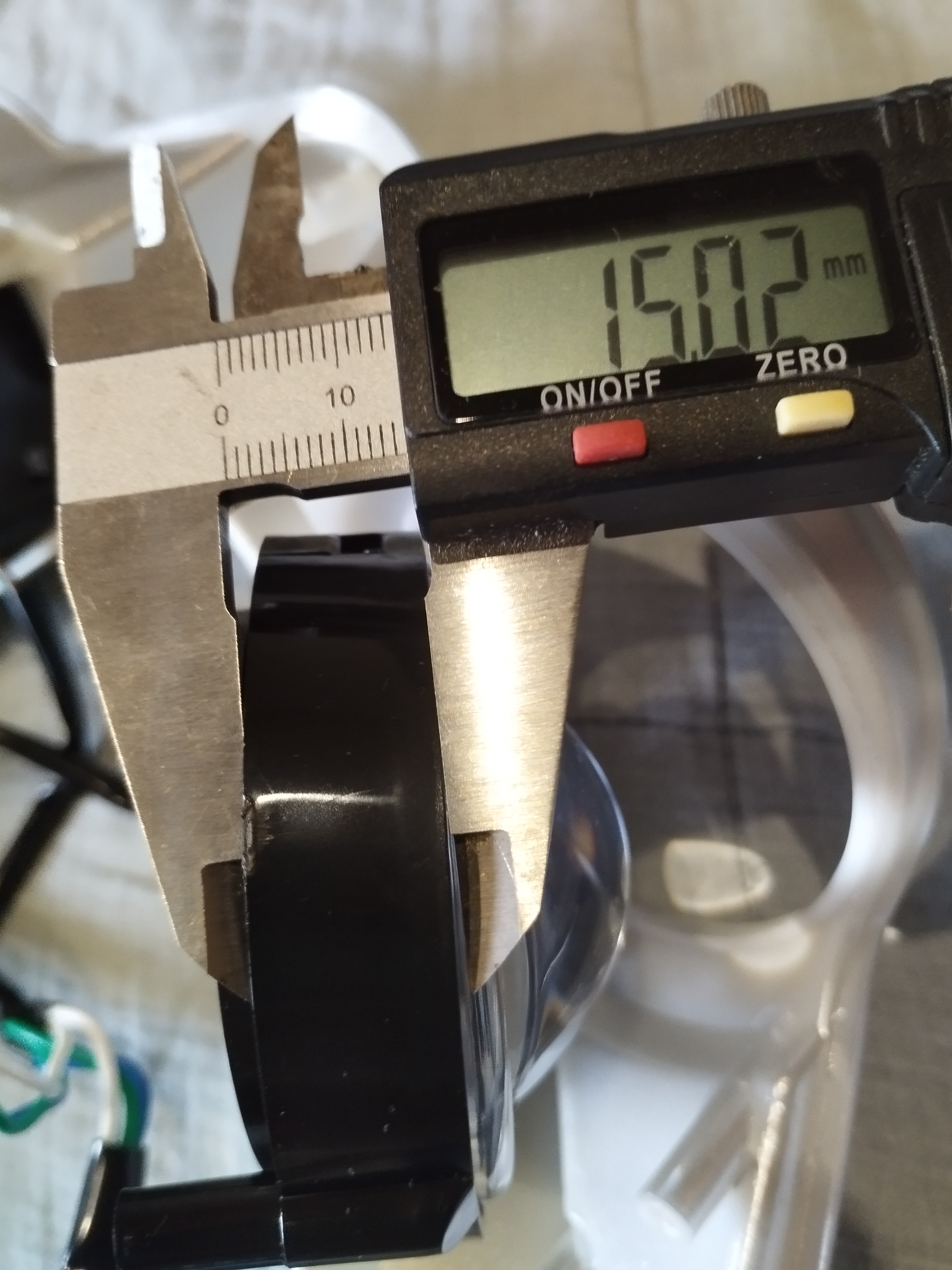 Den äußeren Durchmesser des "Plastik-Topfes" (an der Linsen-Seite) in dem die Platine montiert ist..... also die äußeren Maße des runden Gehäuses, welches in den Angel-Eyes-Ring eingesetzt wird.