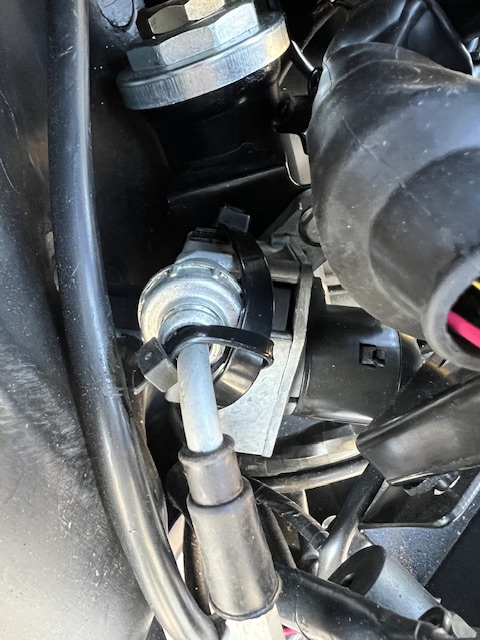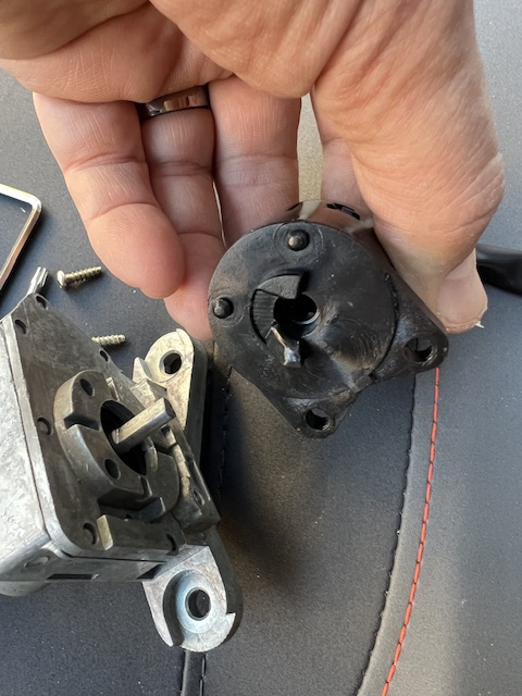 Man kommt mit einem langen Kreuzschraubenzieher von unten beim Zündschloßstecker a die beiden Fixierschrauben. Bei der oberen sitzt der Schraubendreher schräg, aber es geht auf. Zusammenbau dann, indem man das Zündschloß oben mit der linken Hand in Position hält und dann mit der Rechten und jeweils einer aufgesteckten Schraube auf dem Schraubendreher sich nach oben tastet und dann zuschraubt. Der mechanische Teil mit dem Sitzbankseilzug kann eingebaut bleiben.