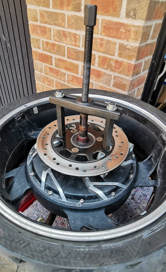 Once the puller goes loose, the bearing is home on the upper place, remove the puller and flip the wheel.