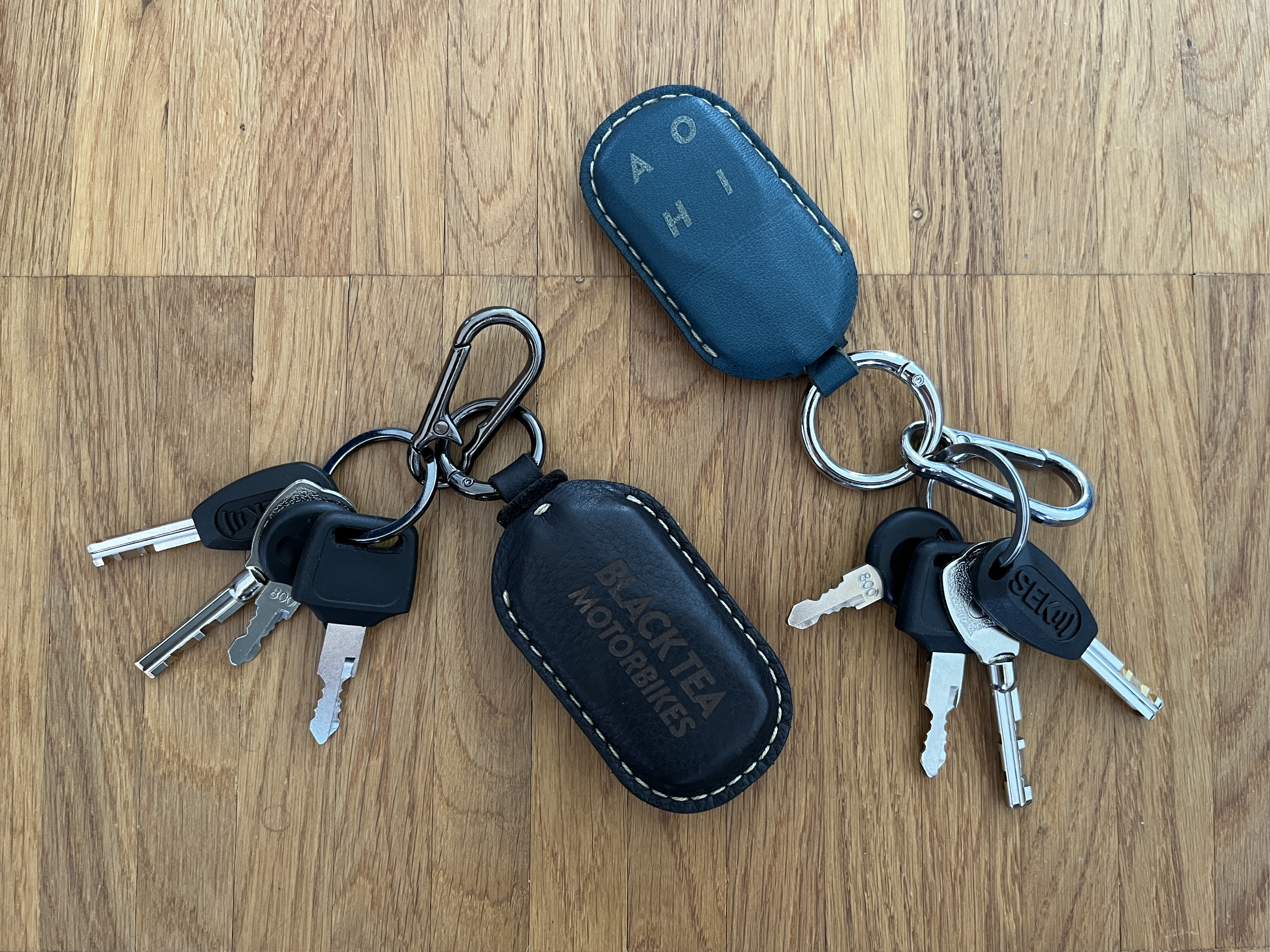 Mich hat vor allem die Optik des Keyless Go Schlüssels gestört, daher habe ich diese in Leder "verpackt". Seitdem habe ich meinen Frieden mit den vielen Schlüsseln geschlossen. Den für das Bügelschloss zum Schutz der Batterien kann man ja eigentlich auch daheim lassen ...