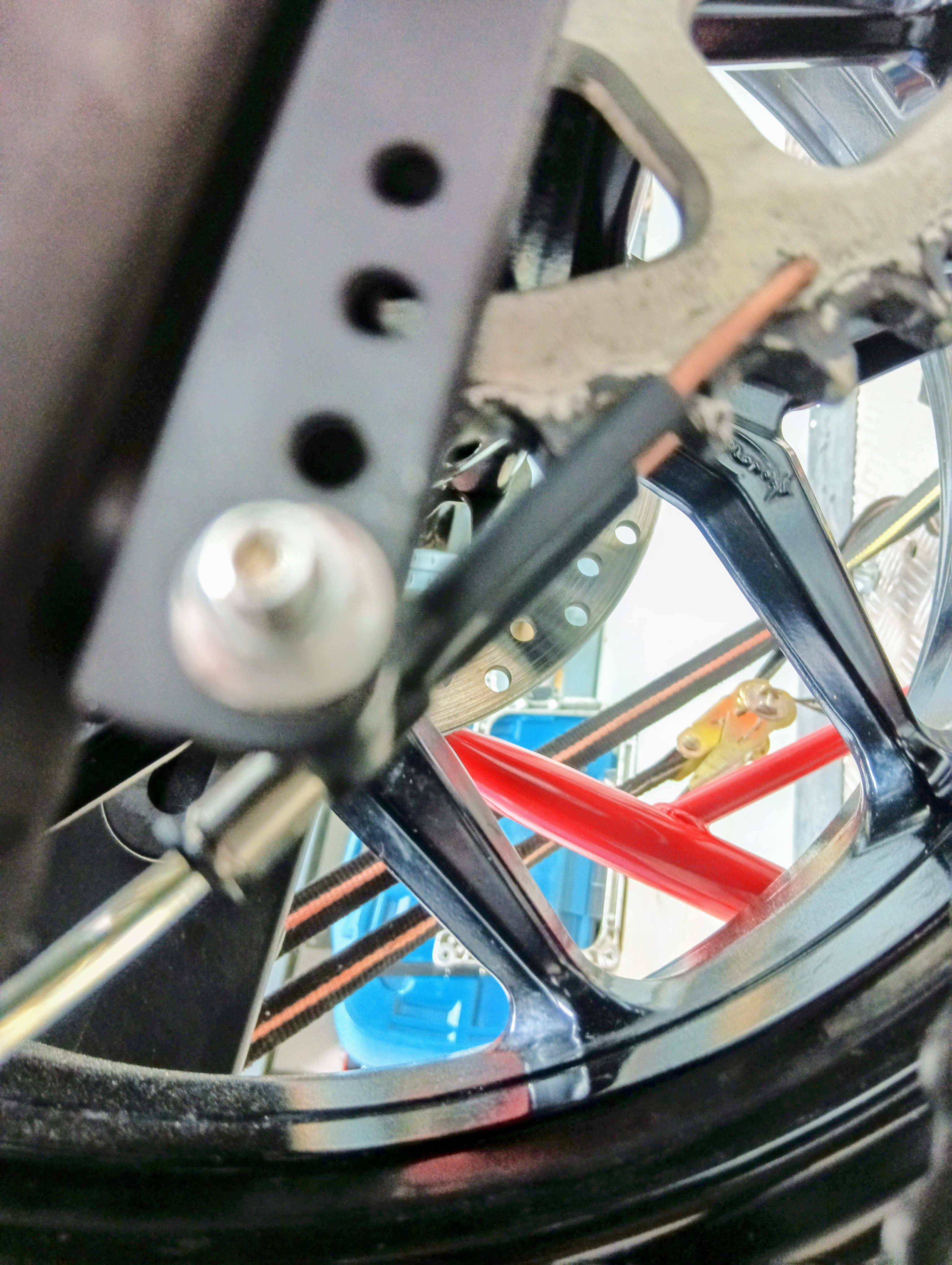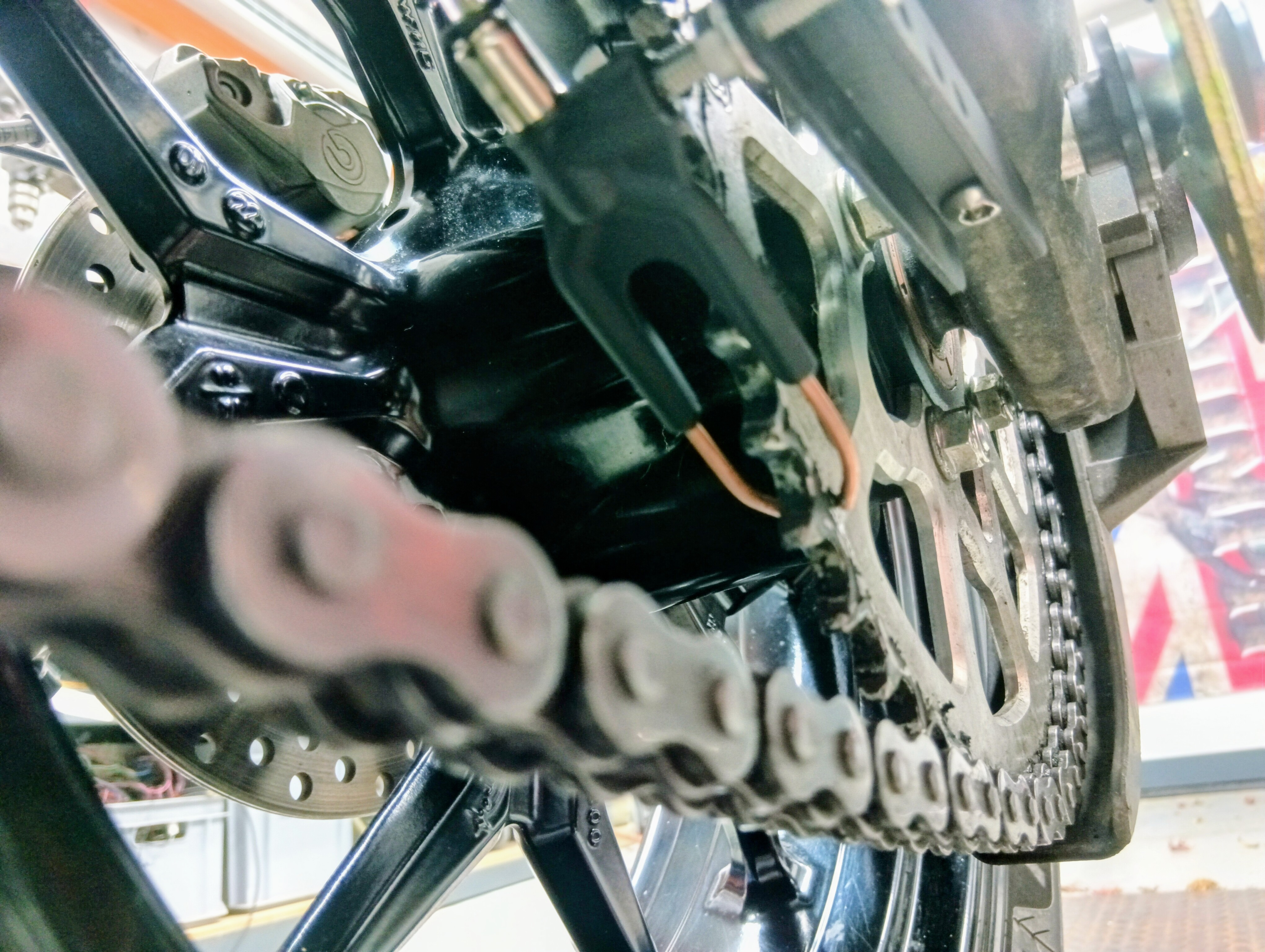 Das notwendige Ventil wurde am Rahmen befestigt, dazu wurde der Stecker vom vorderen ABS Sensor verlegt. Die Ölleitung läuft dann unsichtbar hinter der Bremsleitung nach hinten am Rahmen entlang, über den Motor, folgt der Bremsleitung an der Schwinge unter die Radabdeckung und dann zum Hinterrad. Hier kommt dann eine Doppeldüse zum Einsatz: