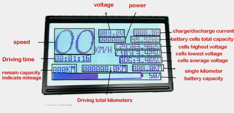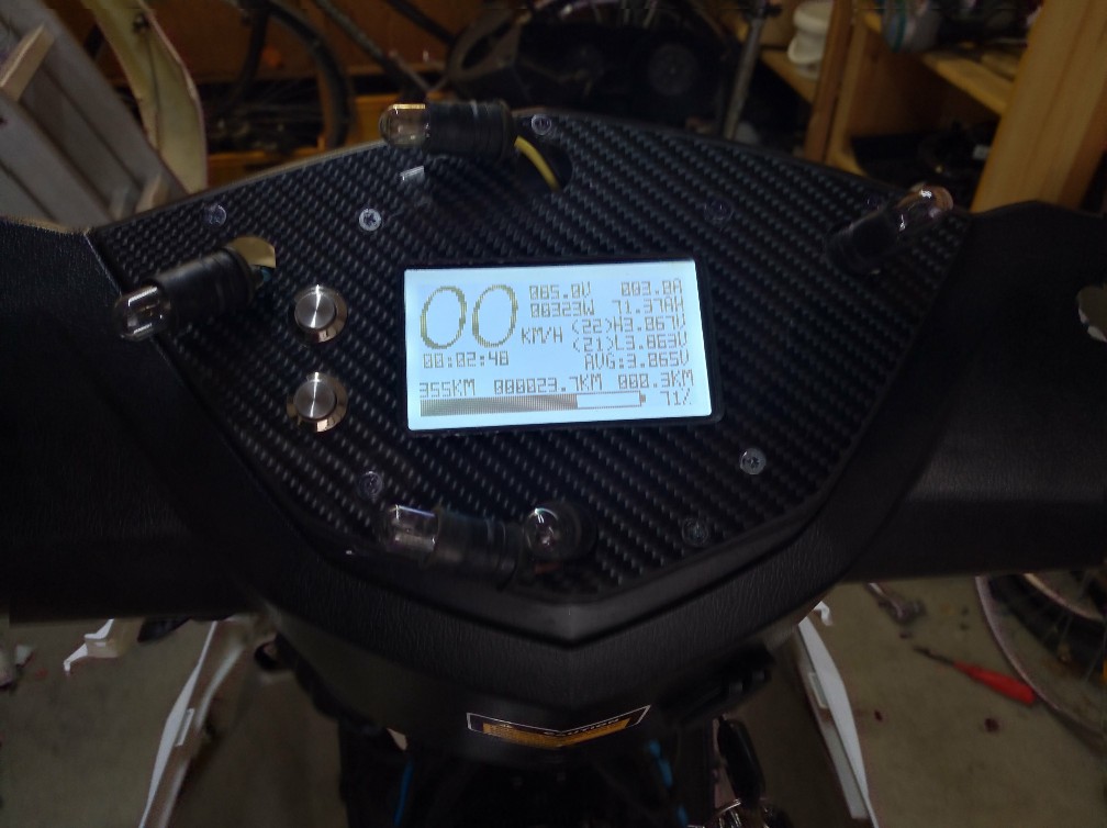 Remain capacity mileage (Restreichweite), single kikometer (Tageskilometer) und driving time setzen sich zurück, wenn man Display stromlos schaltet, Rest bleibt erhalten. Hatte es ursprünglich mit dem Zündschloss eingeschaltet, hab mittlerweile einen Umschalter eingebaut mit dem man folgend Schalten kann.