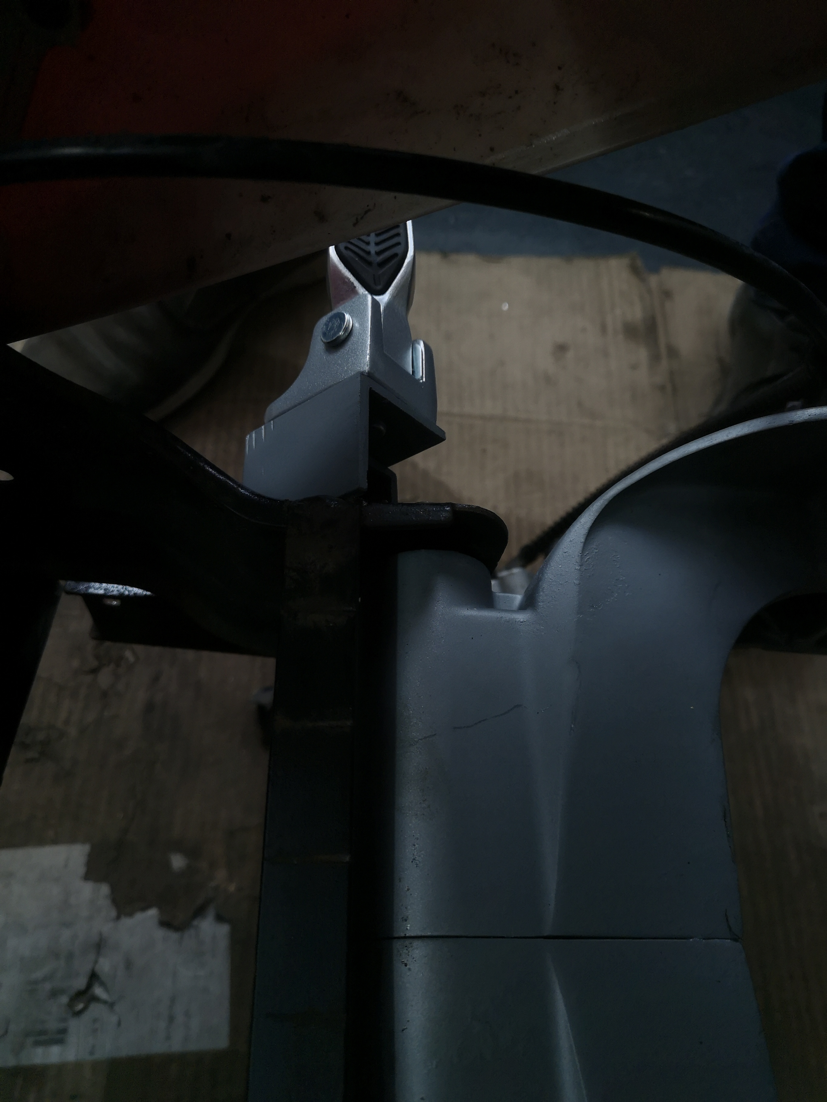 Tatsächlich ist der Hauptständer nicht wie bei dem normalen alten NQI an den stabilen Ohren am Rahmen angeschraubt sondern an einer Quertraverse angeschweißt. Diese Quertraverse ist meine Auffassung von der Materialstärke viel zu dünn um das Gewicht des Rollers angemessen zu tragen.