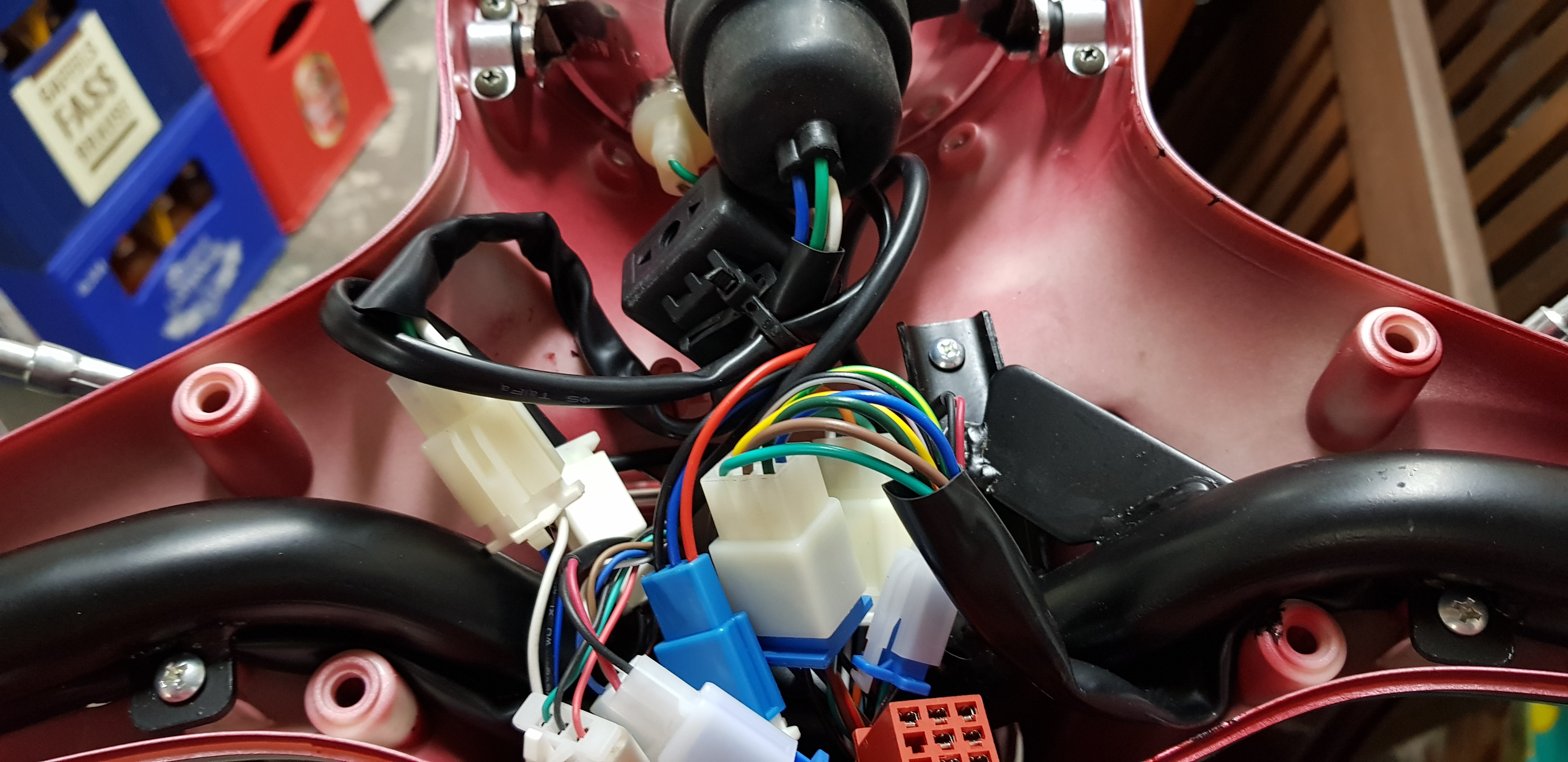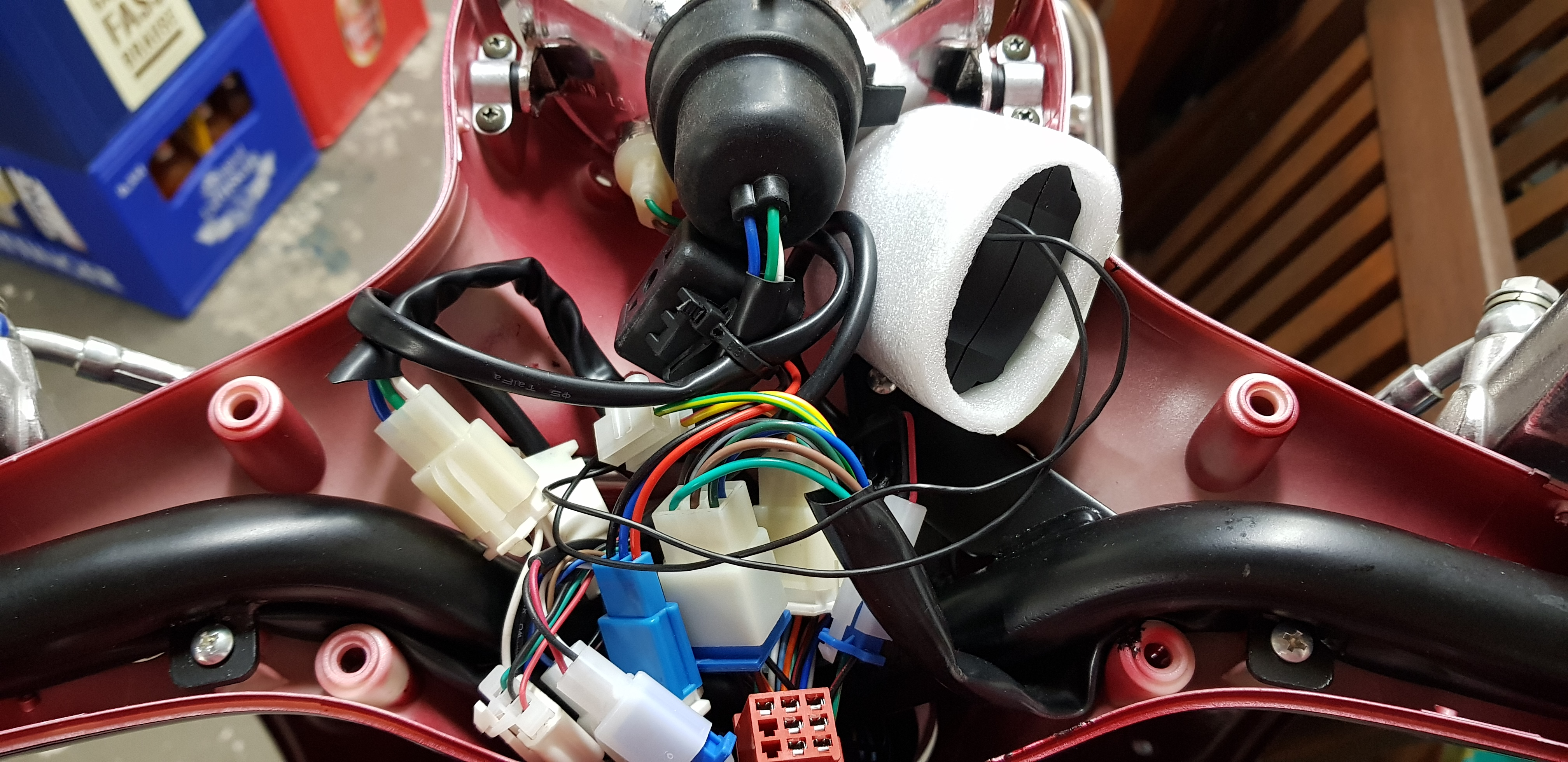 Aber mal im Ernst. Nachdem ich sämtliche Möglichkeiten, die ich mir vorstellen konnte, ausprobiert hatte, habe ich keine Funktion bemerkt, die durch den rechten Taster ausgelöst wurde. Somit habe ich mich dran gemacht, der Sache auf den Grund zu gehen. Ich habe die Lenkerverkleidung entfernt (wobei mir nur ein Nuppi abgebrochen ist - im Winter ist das ja mal schnell passiert. Es wird sich aber nicht negativ auf die Stabilität der Abdeckung auswirken, da es in Verschraubungsnähe war) und die Steckerverbindung des rechten Kabelbaums durch geklingelt. Taster-Kabel gefunden. Obwohl sie auf der anderen Seite des Steckers zwar angeschlossen waren - der Geier weiß wofür, habe ich sie aus dem Stecker gezogen und mit den Taster meines Garagentor-Senders verbunden. Trotz der fummenligen Löterei im Sender hat es geklappt. Den Sender bisschen eingepackt, damit's nicht rappelt, Deckel wieder drauf. Fertig. Bei der Gelegenheit habe ich dann auch noch die Fadenbirne für Abblendlicht/Fernlicht gegen eine 2x10W LED getauscht.