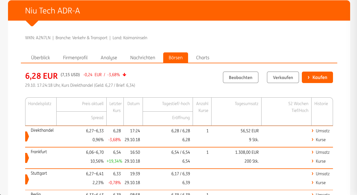 „NIU Tech ADR-A“ kann ab 25.10.2018 an der XETRA-Börse in Frankfurt in Euro gehandelt werden. Die Wertpapierkennnummer lautet: A2N7LN (ISIN: US65481N1000)
