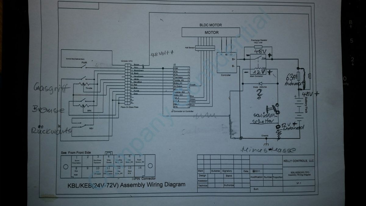Scheinbar liegt Deinem Controller nicht mehr nur eine Kabelpeitsche am runden J2 Stecker bei, sondern da ist ein zweireihiger Stecker am anderen Ende, der im Schaltplan auch aufgeführt ist und eigentlich für die Kelly Testkiste gedacht ist. Aber Dich vielleicht unnötig drausbringt. Halte Dich daher an die J2 Pinbelegung.
