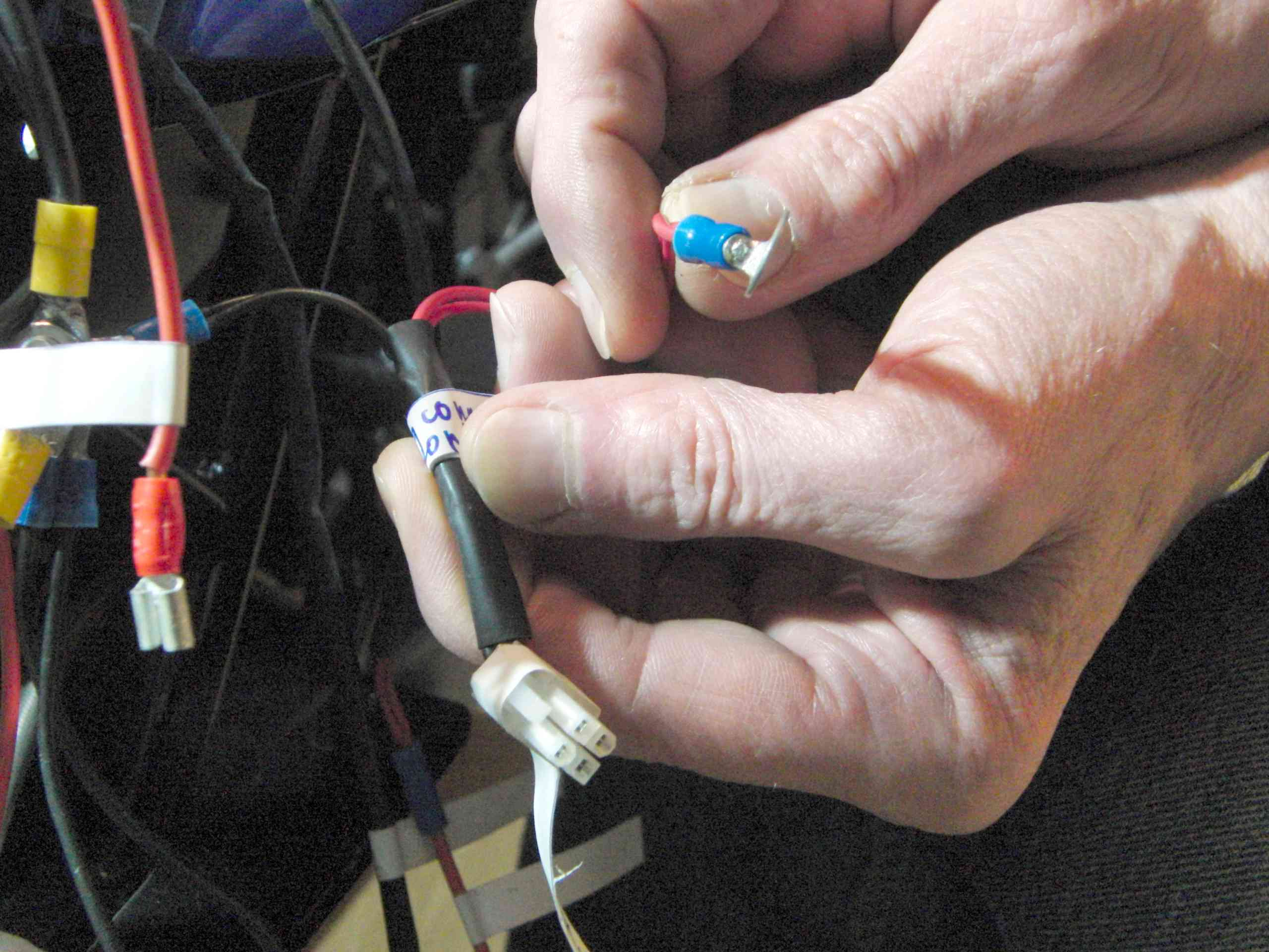 - Von den Buchsen der sechs Kabelstränge, die von der Vorderseite der Maxine zum Umwandler (unter dem Sitz) gehen, sind auch zwei mit jeweils 8 Kontakten. Die entsprechenden Gegenstücke auf dem Umwandler haben die Bezeichnung CN3 und CN4. Der eine 8-Kontakt-Stecker hat 9 Kabel mit diesen Farben: 4 grüne, jeweils 1 braunes, 1 weißes, 1 orangenes und 2 blaue (blau und hellblau). Der andere 8-Kontakt-Stecker hat ebenso 9 Kabel mit folgenden Farben: 4 grüne, 2 braune, jeweils 1 hellblaues, 1 orangenes und 1 grün-gelb gestreiftes. Welcher der Stecker gehört zu CN3 und welcher zu CN4?
