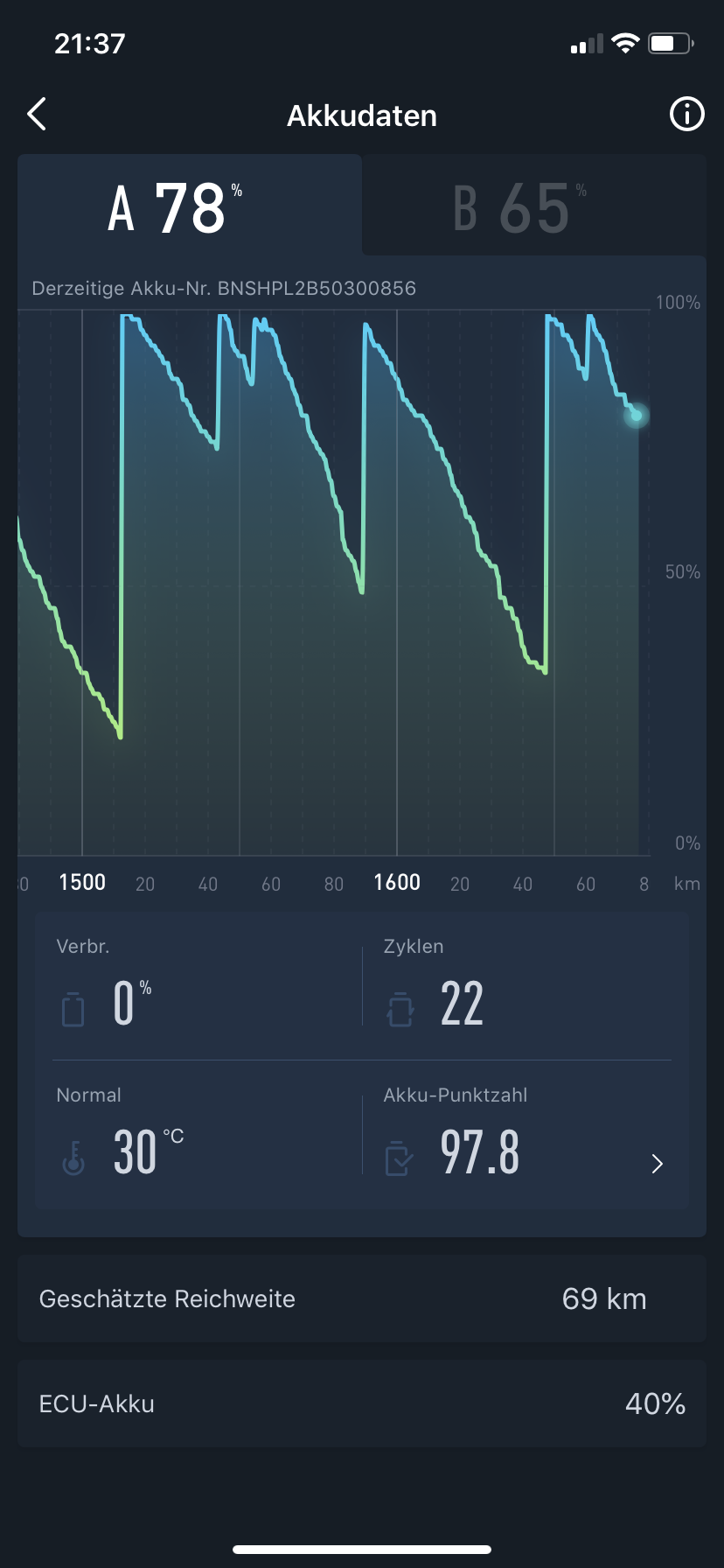 Wieviel Zyklen hast du? Bei mir ist es jetzt immer noch Ok. Ladung zwischen 90-100% dauert wesentlich länger als vorher. Km in der APP sind jetzt auch gestiegen von 72km auf 100km bei 100% Akku.