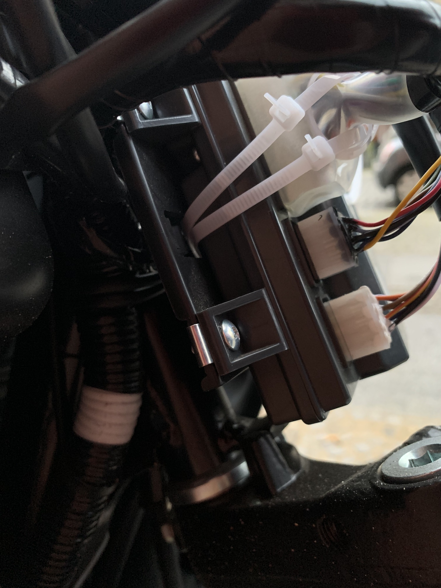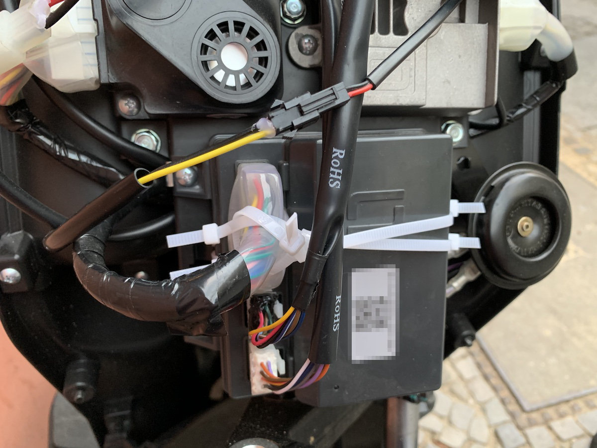 Ich hatte über Monate hinweg genau das gleiche Problem ... und brachte den Roller auch mehrmals in die Werkstatt. Tatsächlich scheint der Stecker das wirkliche Problem (gewesen) zu sein. Da ich auf einer Straße mit Kopfsteinpflaster wohne, ergibt im Nachhinein auch alles einen Sinn. Die Vibration führte ca. alle zwei Wochen zu Problemen: mal sporadisch, mal zum Totalausfall. Wie dem auch sei: die zwei Fotos zeigen, wie ich die Sache nun vorübergehend (mit ein paar Kabelbindern) "gelöst" habe. Ich bin gespannt, ob und wie lange dies hilft. Vielen Dank an alle hier im Thread, die zur Lösung beigetragen haben. -- Alex
