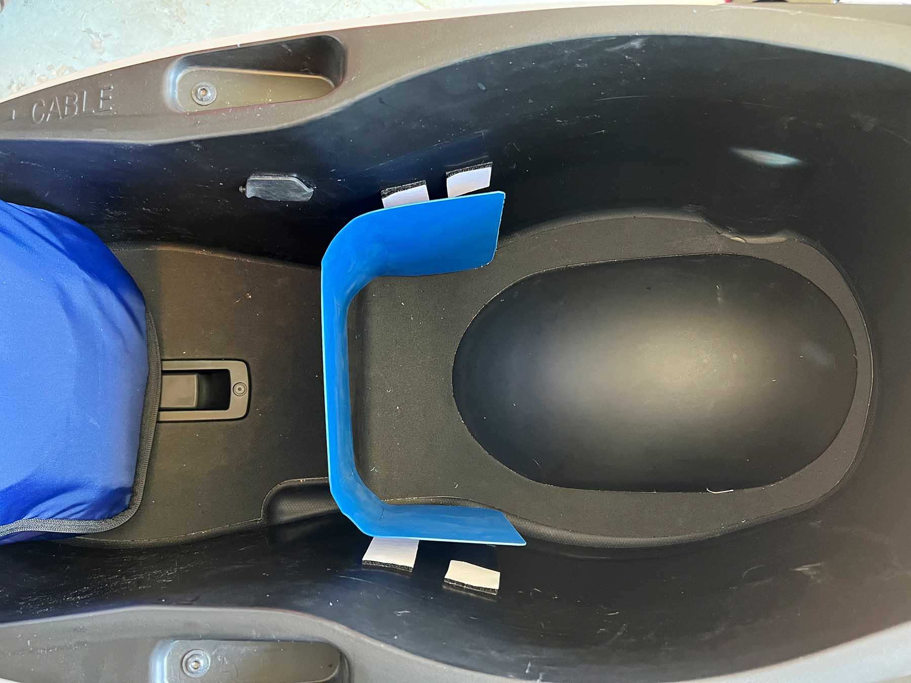Im Modellbauhandel/Bastelläden gibt es dünne, flexible Kunststoffplatten (z.B. Polystyrolplatte, 0,5mm ... schwarz war leider aus, deswegen blau), die man auch mit dem Heissluftfön in Form biegen kann. Also habe ich mir zuerst eine Kartonschablone angefertigt, Form der Schablone auf die Kunststoffplatte übertragen, mit der Schere ausgeschnitten und an den zu biegenden Kanten über einem dicken Rohr mit dem Heissluftfön erwärmt und einen schönen Radius gebogen. Eingeklebt würde es (mit der Flausch-Seite des Klettbandes Richtung Fach-Innenraum) mit den wirklich brutal klebenden Industrieklettband / kleine geschnittene Rechtecke/Vierecke.