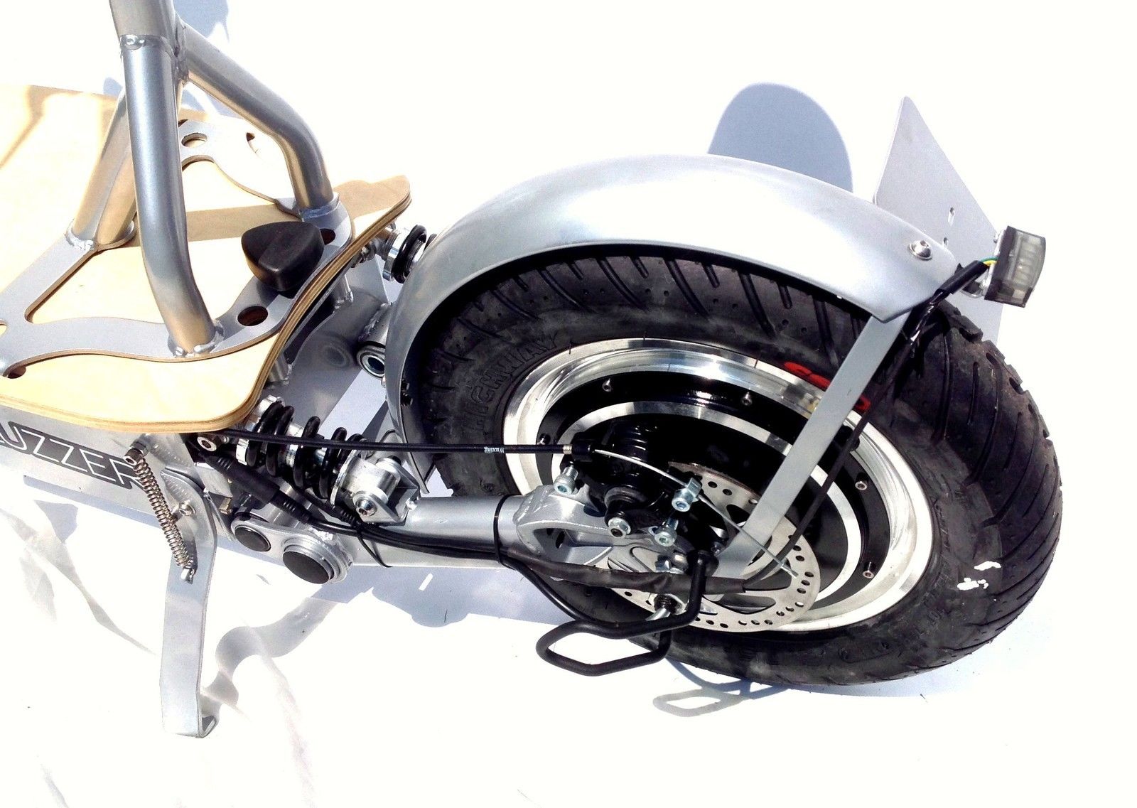 Ganz außen an der Achse sieht man nunmehr kein Kabel. Aber rein technisch gesehen geht es nicht anders, als dass das Kabel durch die Achse geführt wird, denn außen an der Felge kann man es wahrlich nicht anbringen. Ich gehe deshalb davon aus, dass das Kabel weiter hinten durch ein Loch in der Achse in diese eingeführt wird und zum Motor läuft. Dadurch ist auch gewährleistet, dass bei einem Umkippen des Rollers das Motorkabel nicht mehr zerquetscht werden kann, wofür es für die Modelle der 1er Serie ja auch den Schutzbügel gab, der nun nicht mehr erforderlich ist.