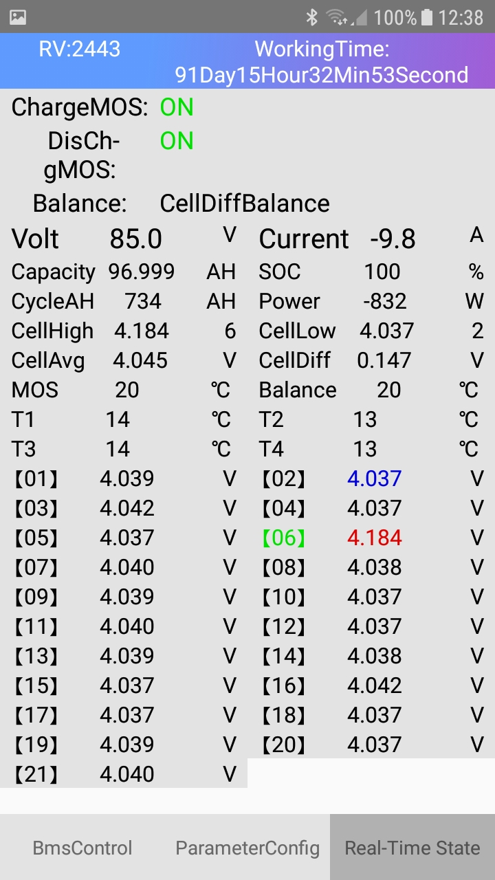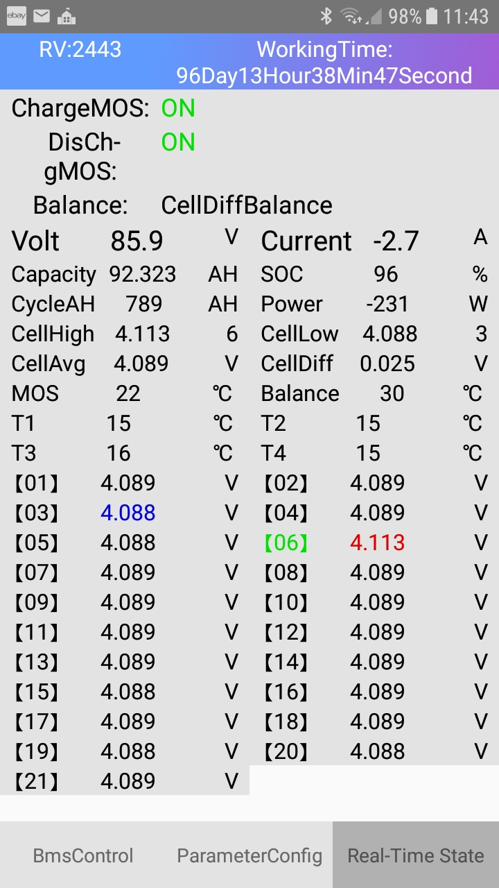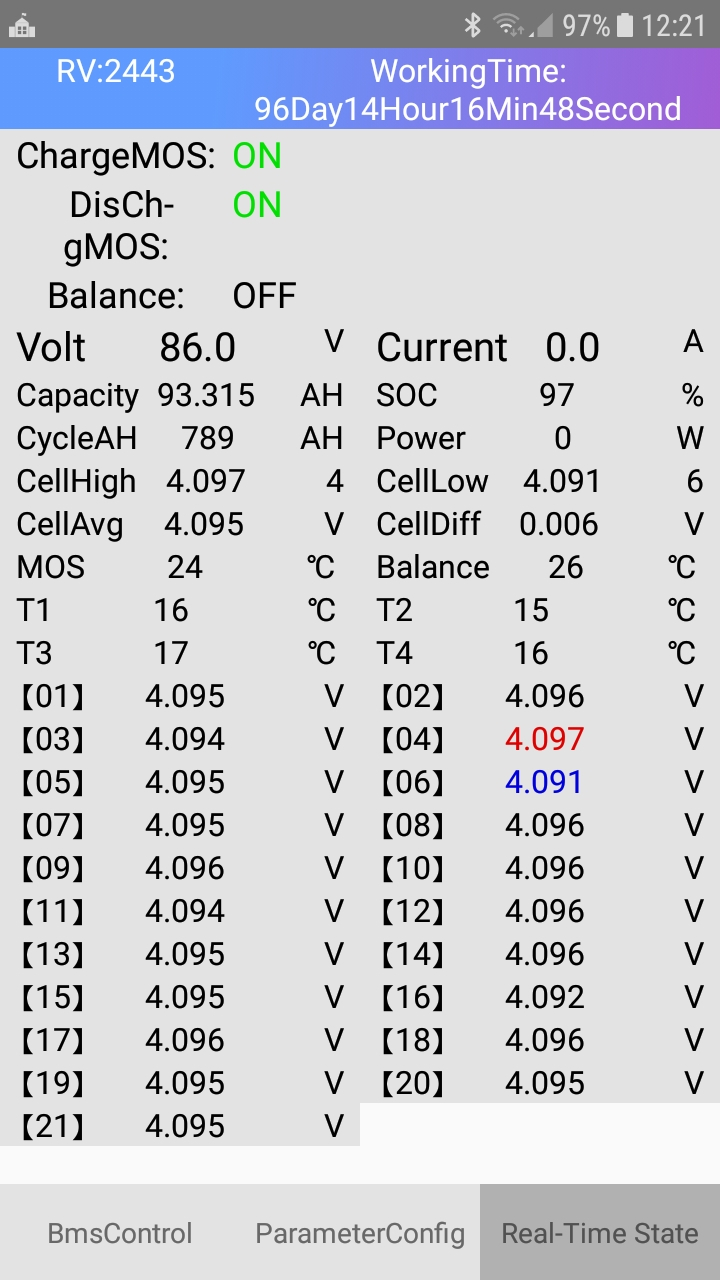 Da ich den Wert der Kapa-Anzeige aktuell nicht ändern kann gehe ich davon aus das es für die 100% SOC Anzeige nur die Spannung der vollsten Zelle nimmt und dann auch die Kappa-Anzeige auf 100% (97Ah) anpasst, als 100% Wert steht 4,15V drin.