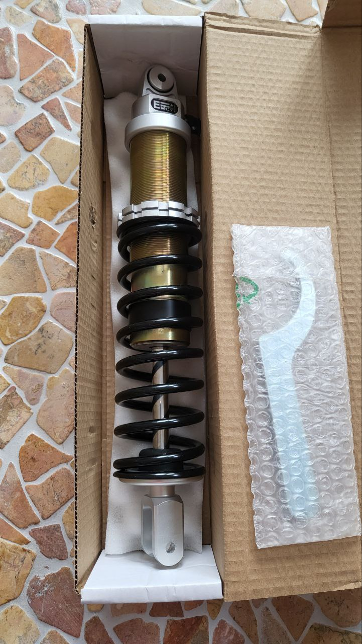 Und was soll ich sagen, anfangs glaubte ich keinen so großen Unterscheid zu bemerken. Dann habe ich allerdings die Kontermuttern der Feder soweit wie möglich nach oben verändert und merkte dann eine deutlich weichere, angenehmere Federung. Dann beim Einkaufen in der Packbox noch 2 Paletten alkoholisches Kaltgetränk eingeladen und mein Roller federte weich wie ein alter Cadillac.