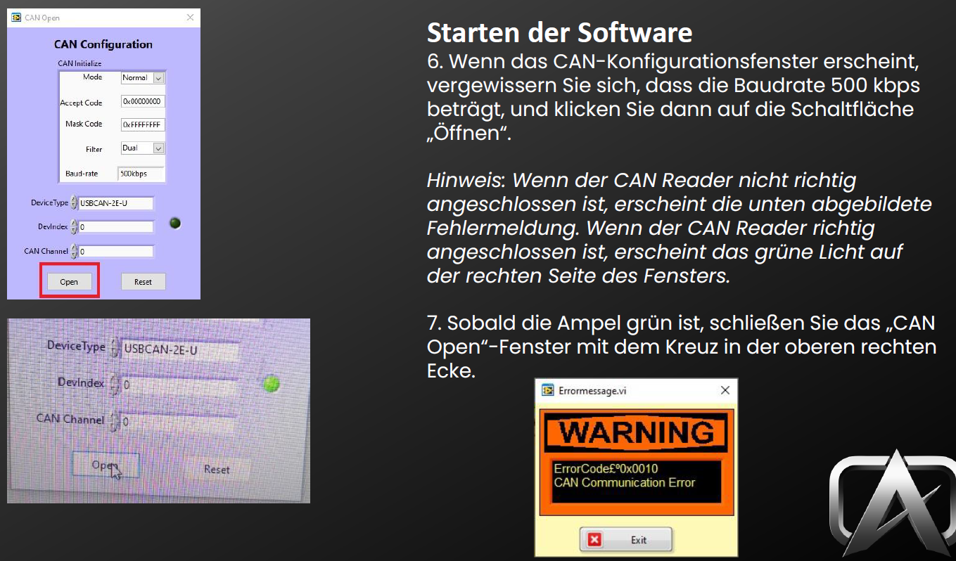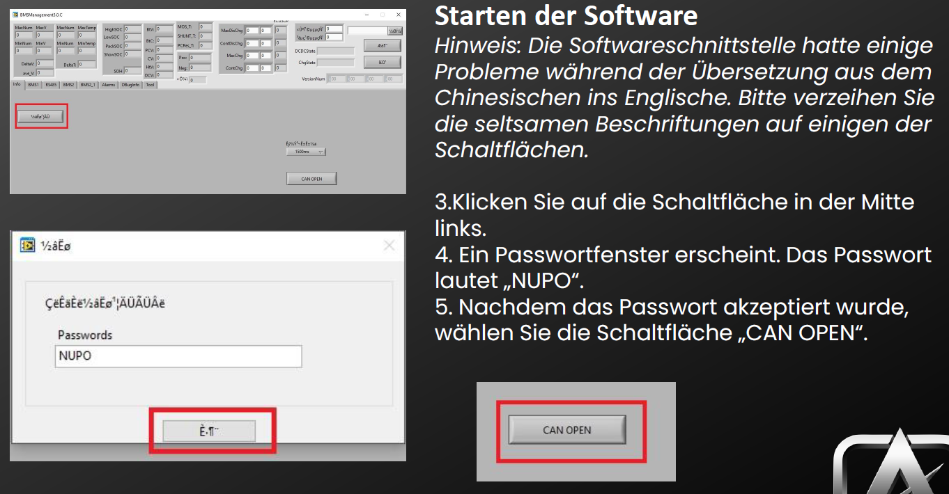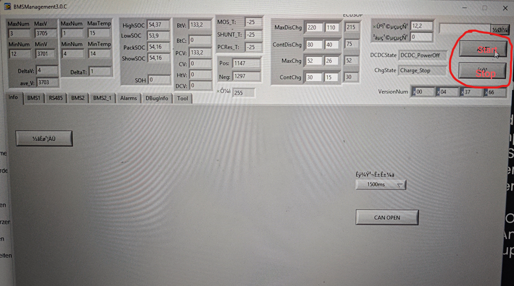 Folgende Schritte habe ich laut Anleitung gemacht, wobei man sich die Eingabe des Passworts auch sparen und direkt auf CANOPEN klicken kann: Dann muss man aber die Verbindung noch starten, was wegen der komischen Schriftzeichen nicht zu erkennen ist. Oben rechts gibt es die Schaltflächen Start + Stop. Danach kann man diverse Werte im oberen Bereich und unter den Reitern BMS2 und BMS2_1 auslesen.