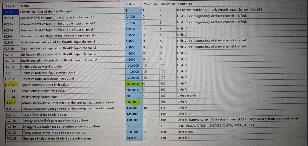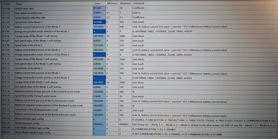 Die Geschwindigkeit im ECO-Modus auf dem Ständer hat schonmal funktioniert. Vielleicht kann man auf Seite 2 auch den Batteriestrom für etwas mehr Leistung (FC2-12) und den Strom der Rekuperation (FC2-15) anpassen.