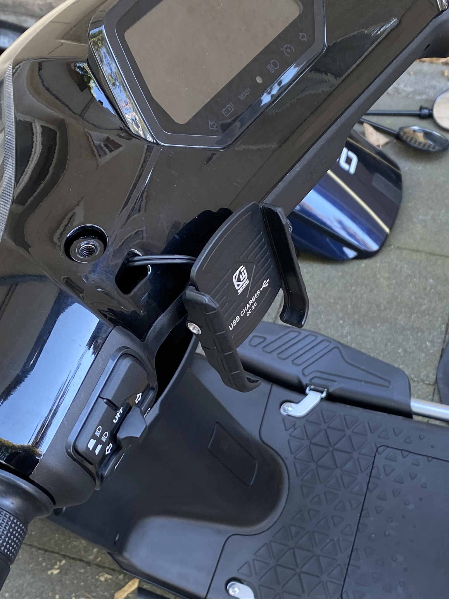 der untere Teil der Halterung welcher als Klemmschelle um ein Lenkerrohr passt lässt sich vom Hauptteil abschrauben. Man muss ein kleines (4mm) Loch in die Verkleidung des Rollers bohren. Durch dieses habe ich den Handyhalter dann festgeschraubt. Es ist die schwarze Kreuz-Schraube auf dem zweiten Bild. Zudem wurde zwischen Verkleidung und Handyhalterung ein kleines Stück Spiegel-Montageband geklebt. Wahrscheinlich keine ideale, für mich aber eine ausreichend gute Lösung.