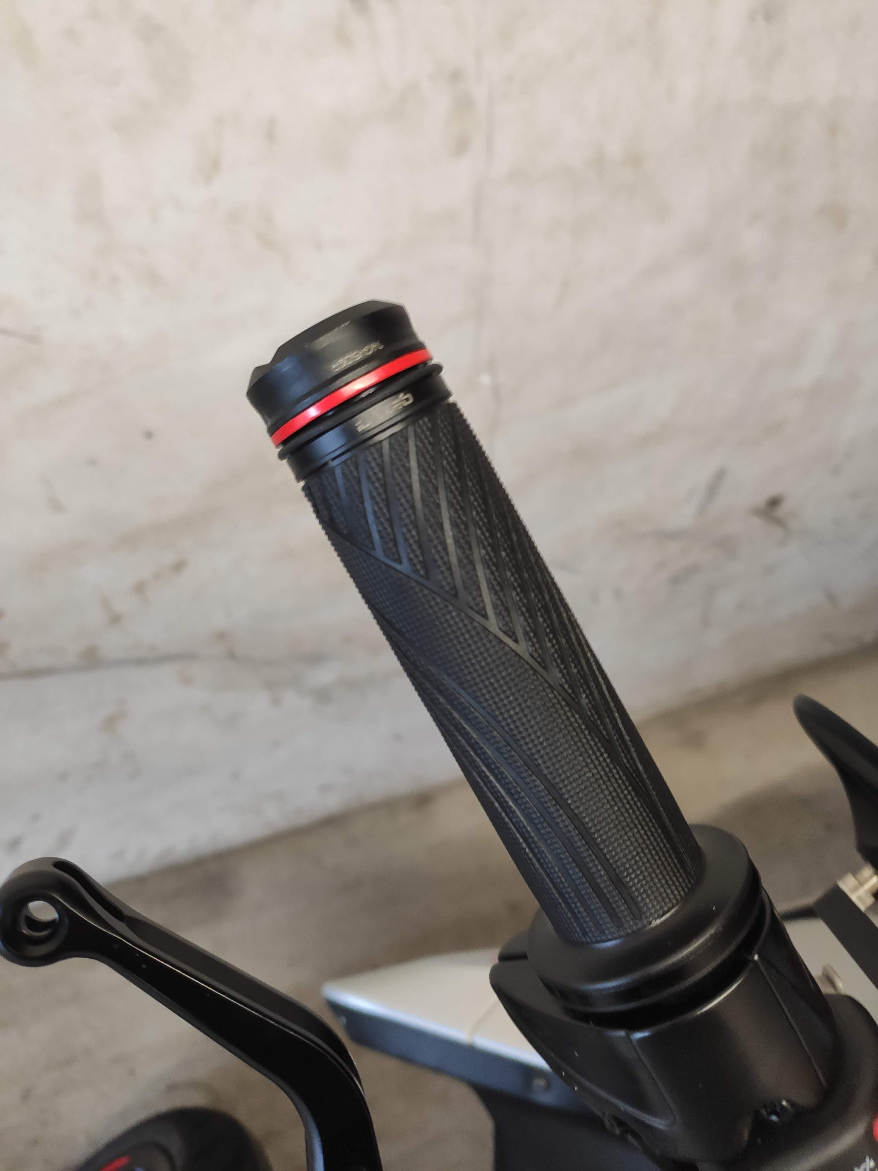 (das rote Detail hab ich foliert, nachdem die rote Anodisierung von Lenkerende rosa geworden war. Die Griffe haben etwas mehr "Fleisch", Griffumfang als die Originalen, was mir ganz gut gefällt.