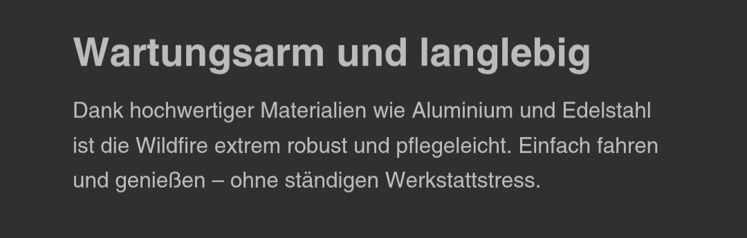 Finde es nur irritierend, wenn ich folgendes auf der Homepage lese und Viktor dann im Video sagt, dass man die großen Flächen der Wildfire mit WD40 gegen Rost schützen soll