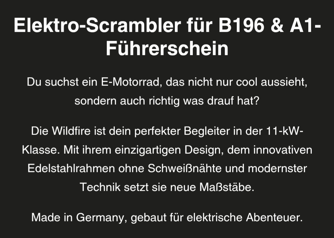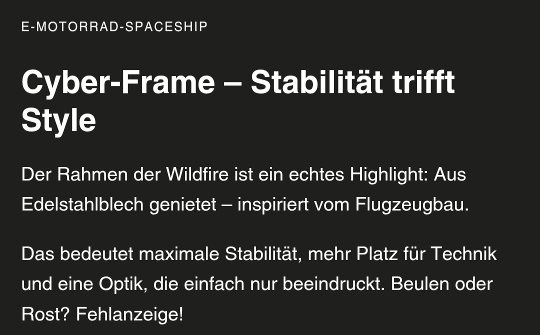 Wegen der Kosten! BTM als Firma und speziell die Wildfire vom Konzept her sind einfach ziemlich Exoten. Wenn die nicht den Preisvorteil hätten... wer würde sich so ein Motorrad kaufen?Mondial hat geschrieben: Fr 14. Feb 2025, 18:50 Ich wundere mich ein wenig, und habe gedacht, dass die Wildfire nur aus Edelstahl, Aluminium und Kunststoff bestünde. Wozu noch Stahl?