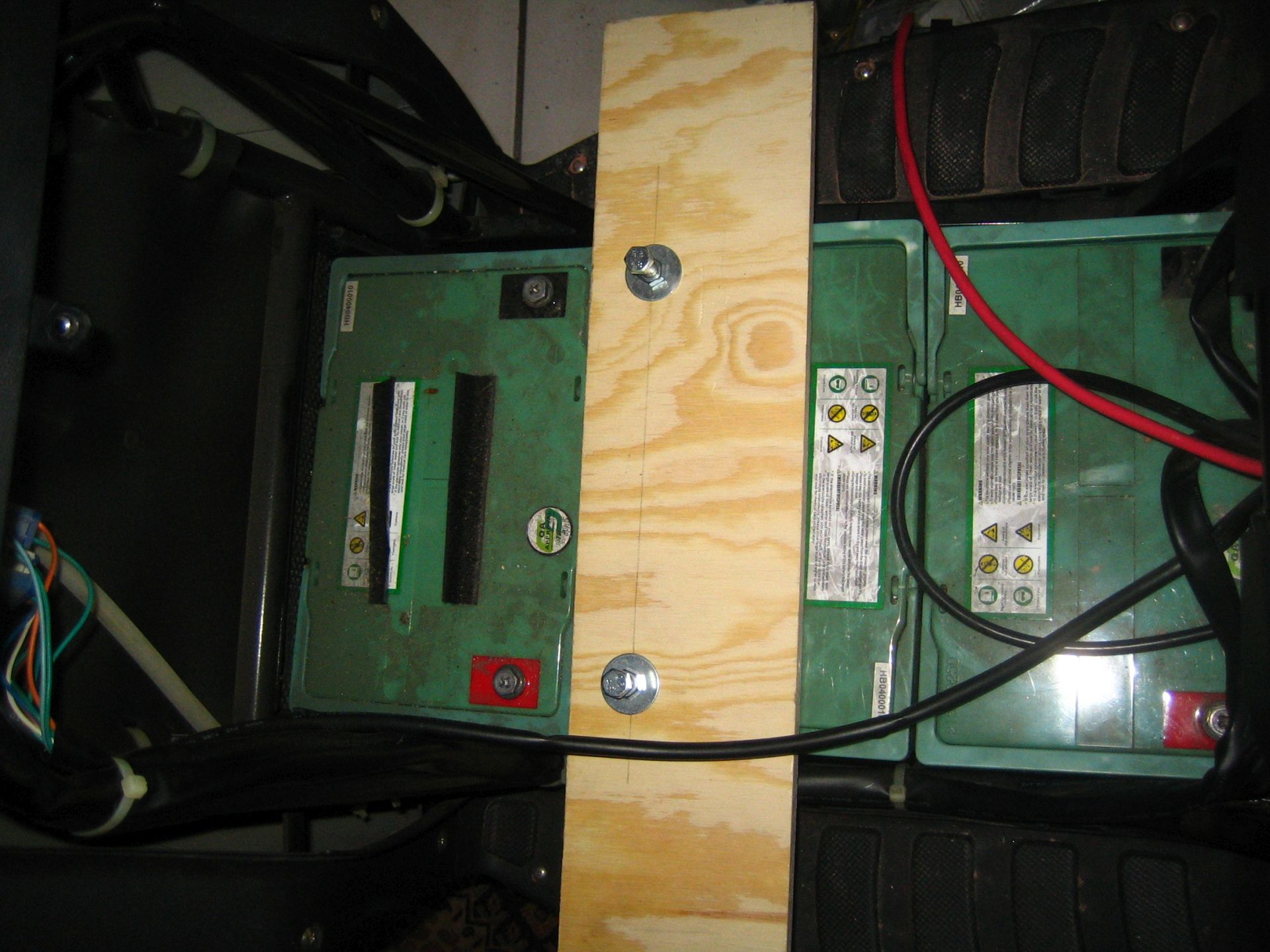 Zuerst müssen die alten Greensaver Bleiklötze ausgebaut werden. Wenn man mit dem Ausbau der 2. Batterie nicht weiter kommt hilft ein Brett. Auch die 4. Batterie ist mit Klettband am Batteriefachboden befestigt. Nach lösen der Motorphasenkabel und lösen einiger Schrauben kann man man das Helmfach ein wenig anheben. Dann kommen die 16 prismatischen LiFePo4 Zellen - 50Ah, 75Ah, 80Ah, 90Ah, 100Ah oder 105Ah je nach Geldbeutel und Reichweitenbedarf - in das Batteriefach. Es ist ein JK 1A 24S Balancer aus dem Rollerkarton verbaut - deswegen sind 8 Balancerkabel unbelegt. Das 15 bis 17S JK BMS kommt Mitte/Ende März. Der JK Balancer ist auf einem schrägen Sperrholzbrett montiert und spannt das Akkupaket. Zwischen den Zellen habe ich 0,75mm Makrolon, Polycarbonat zur Isolierung verbaut. Der Akkupack ist gut balanciert.