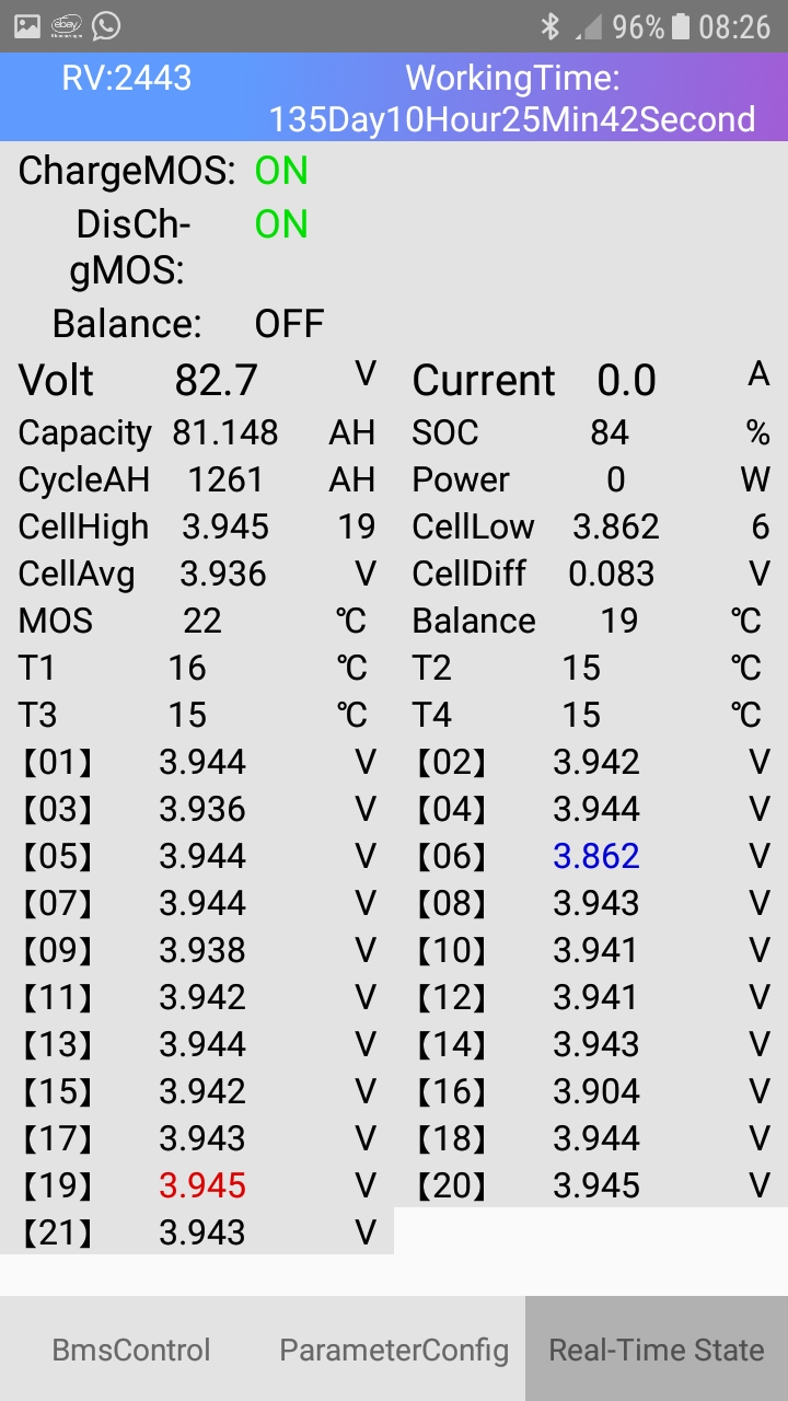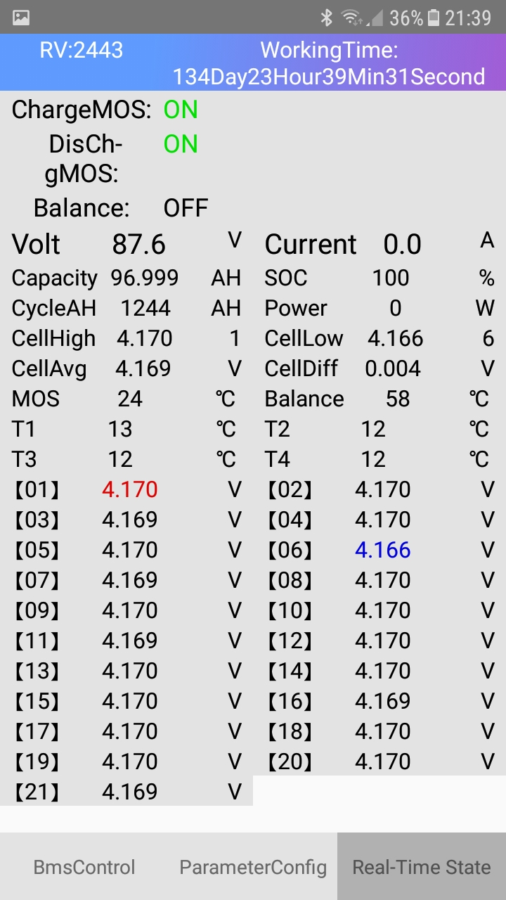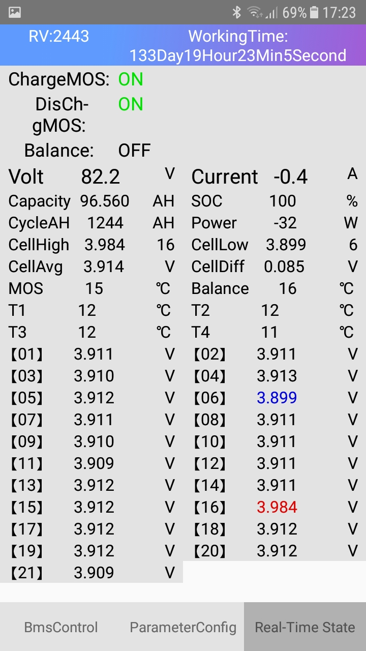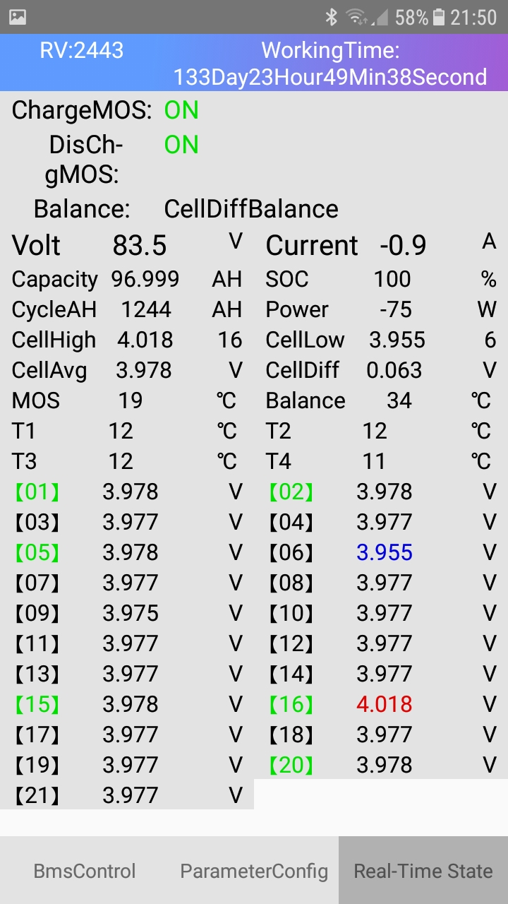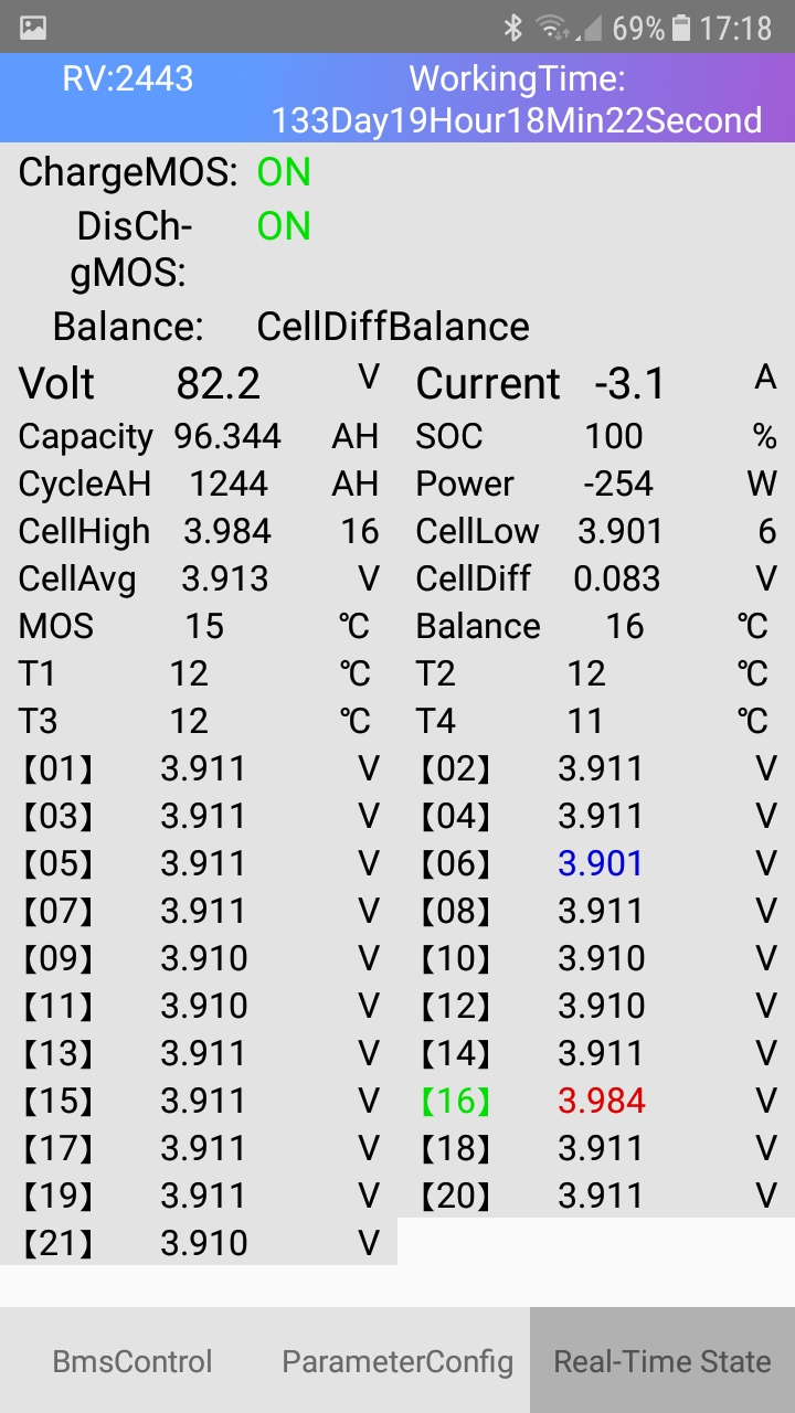 Unterhalb 0,6A Ladestrom stellt das ANT BMS das balancieren aus. Bei Anzeige von 61Grad Balancer-Temperatur wird unterbrochen bis die Temperatur wieder auf 60Grad sinkt. Mein mit Kühlkörpern versehenes BMS hat dabei außen keine 40Grad. Die Messung ist wohl direkt zwischen den Widerständen.